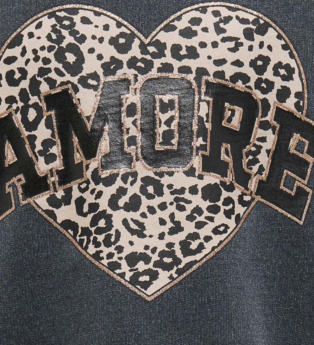 Smart Kids Only sweatshirt imørkegrå med et stort hjerte i leopardprint på fronten med teksten “Amor” og detaljer i guld glimmer. Kids Only sweatshirten har lange ærmer og rund hals med bred ribkant ved ærmer og talje. Indvendigt er der blødt, børstet bomuld.