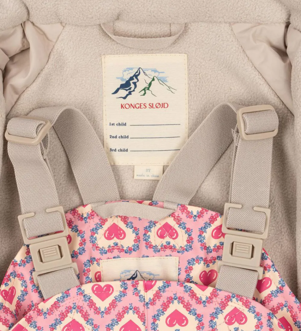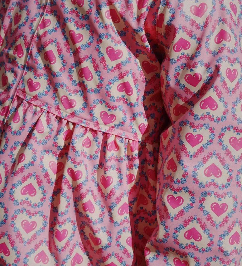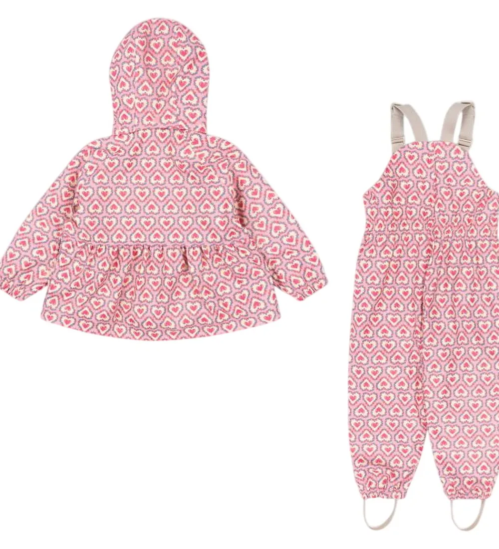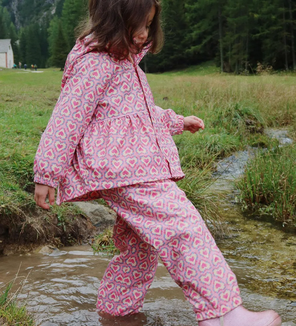 Fint Konges Sløjd regntøj af PU i rosa med et alloverprint af hjerter og blomster i blå og rosa nuancer.
