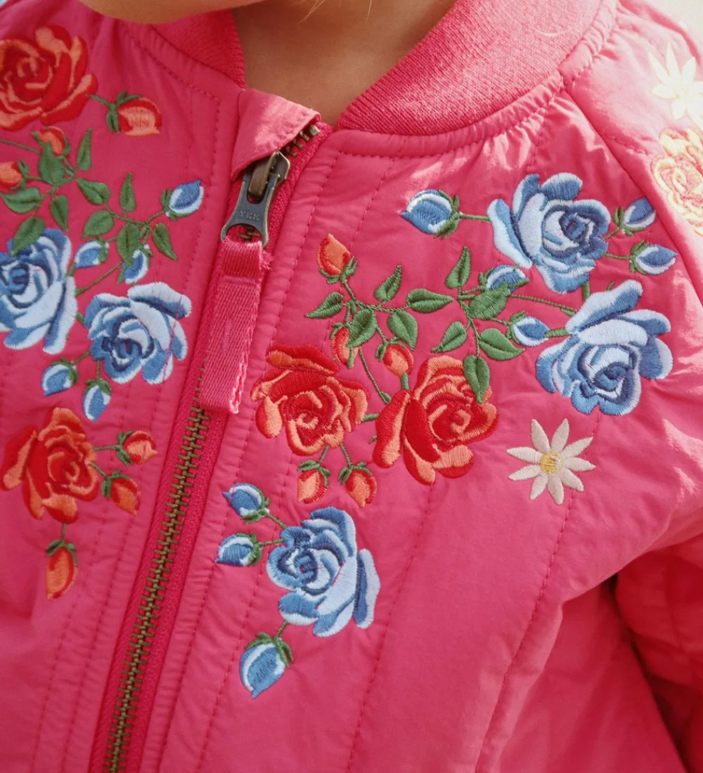 Smuk Konges Sløjd termojakke i qulitet rosa med broderede blomster.