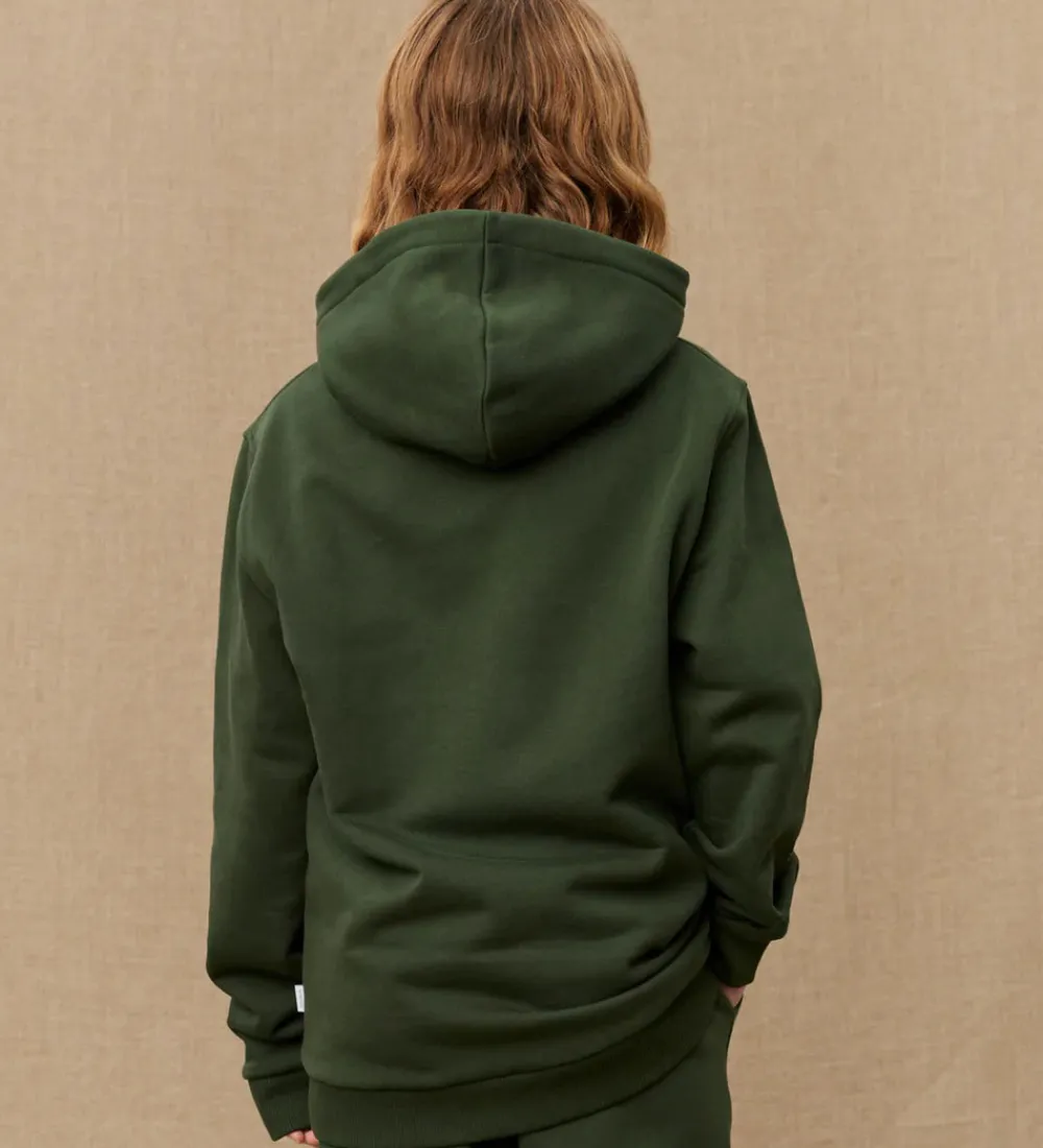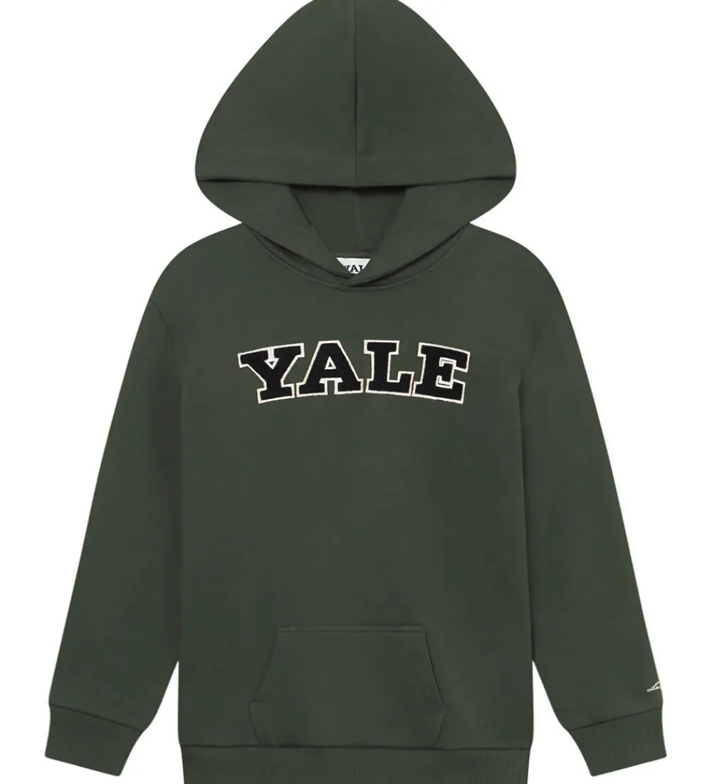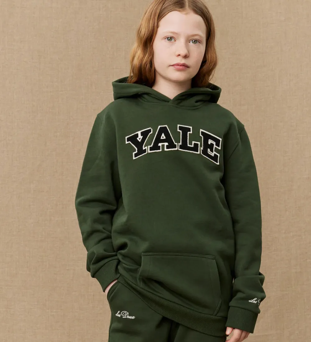 Stilren hættetrøje fra Les Deux i en dyb grøn farve med et markant broderi af ordet “YALE” i hvid og sort på brystet. Hættetrøjen er designet med en praktisk kængurulomme på fronten og ribkanter ved håndleddene og nederst på trøjen for en god pasform. Les Deux hættetrøjen har blødt børstet bomuld på indersiden.
