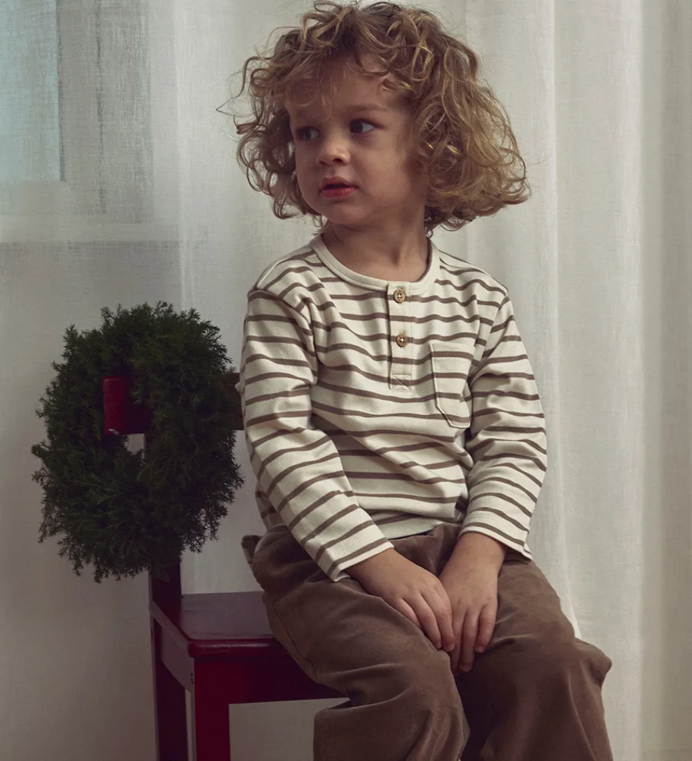 Elegant bluse fra Lil Atelier i lys beige med vandrette, brune striber. Blusen har en rund halsudskæring med to brune knapper foran samt en lille brystlomme. Den har lange ærmer og den er en smule længere bagpå.