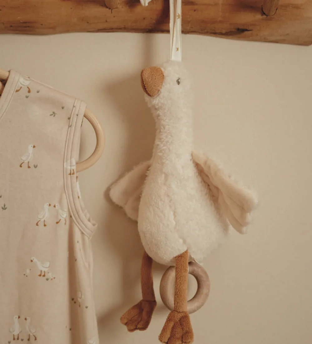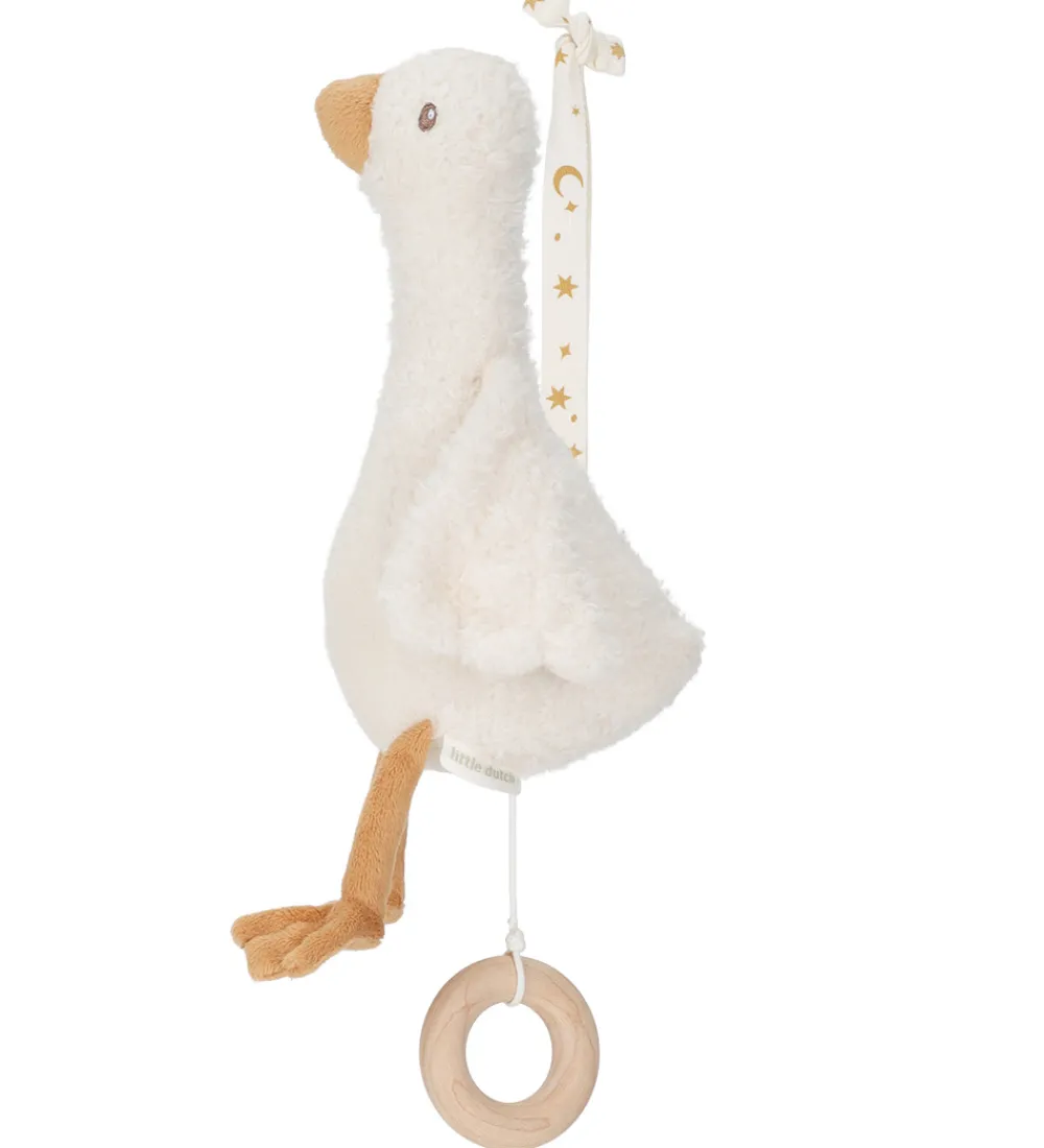 Charmerende Little Dutch musikuroformet som en gås i hvidt plys. Little Dutch musikuroen hænges op med to bindebånd, og når man trækker i den runde træring, bliver baby taget med på fantastiske drømmeeventyr når melodien spiller.