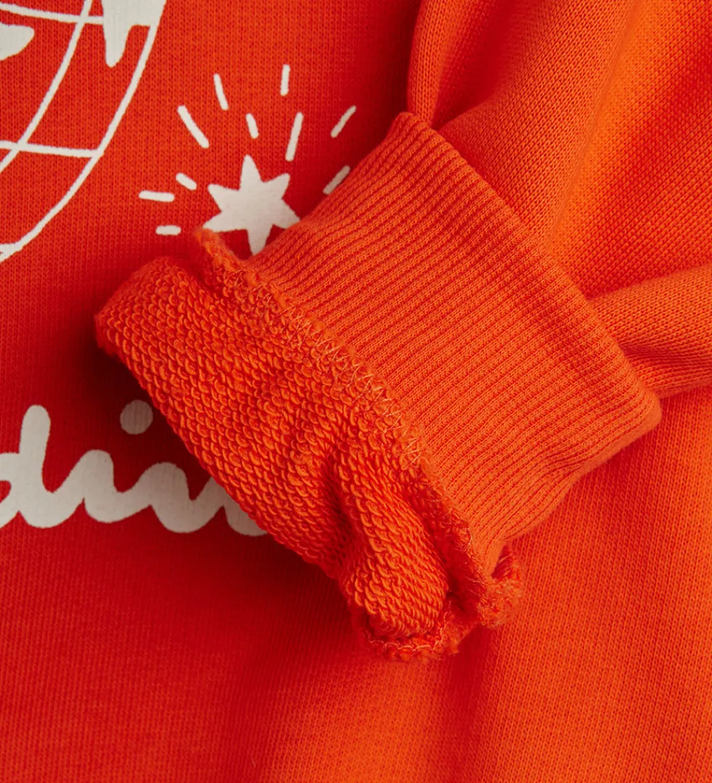 Smart Mini Rodini sweatshirt i en iøjnefaldende, rød farve med et stort print af en globus og små stjernemotiver. Mini Rodini sweatshirten har ribkanter ved halsen, ærmerne og bunden, som sikrer en klassisk og stilfuld pasform.