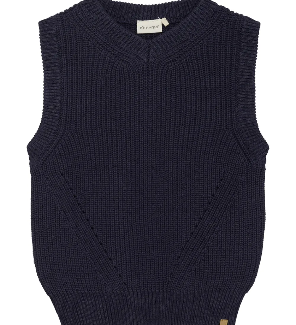 Flot Minymo vest i navyblå med ribstrikket struktur. Minymo vesten har brede skulderstropper og v-udskæring. Den har ribkanter i alle åbninger.
