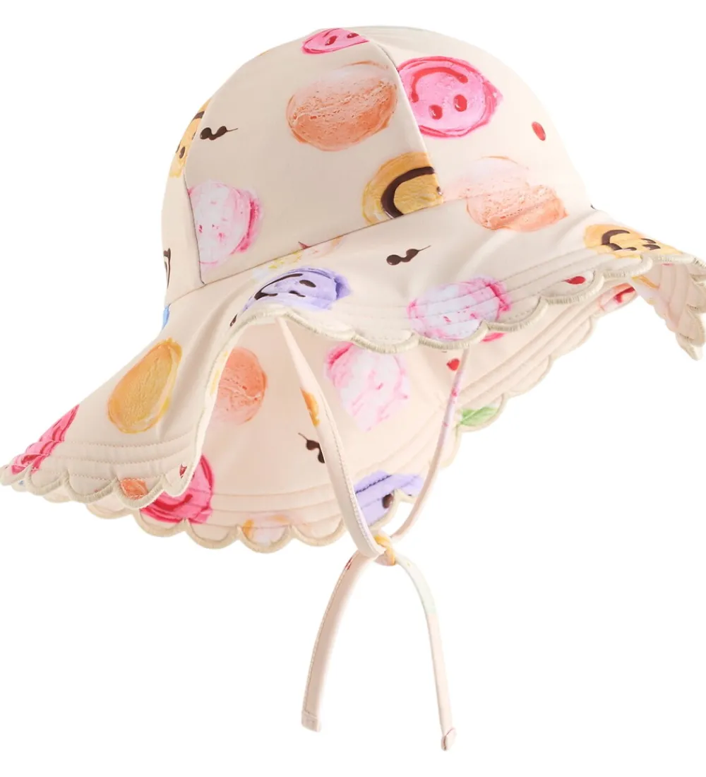 Charmerende Molo badehat i lys beige, med et mønster af farverige iskugler og smilende ansigter. Badehatten har en bred skygge hele vejen rundt med en bølget kant. Den bindes under hagen med bindebånd. Badehatten har et praktisk UV-filter på 50+.