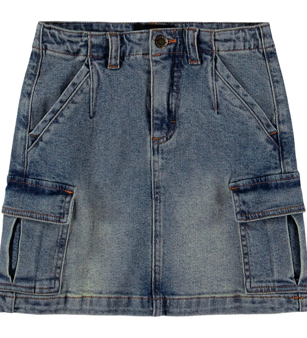 Elegant Molo nederdel i en klassisk denim farve. Fortil lukkes nederdelen med en trykknap og en lynlås, mens taljen justeres med indvendige elastikker. Molo nederdelen har praktiske lommer foran og på siderne samt pynte lommer bagpå.