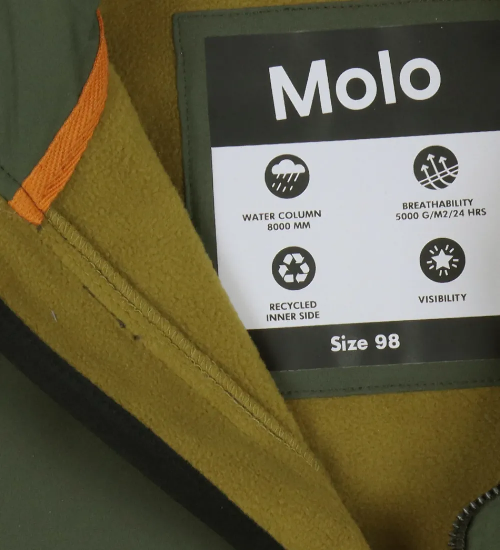 Molo softshelljakken har brede ribkanter, og den åbnes med en lynlås med hagebeskytter og indvendig vindstolpe. I siderne er der praktiske, fleeceforede lommer, som lukkes med en lynlås. Softshelljakken er foret med blødt fleece i brun. Nederst på ryggen er der et praktisk refleksprint.
