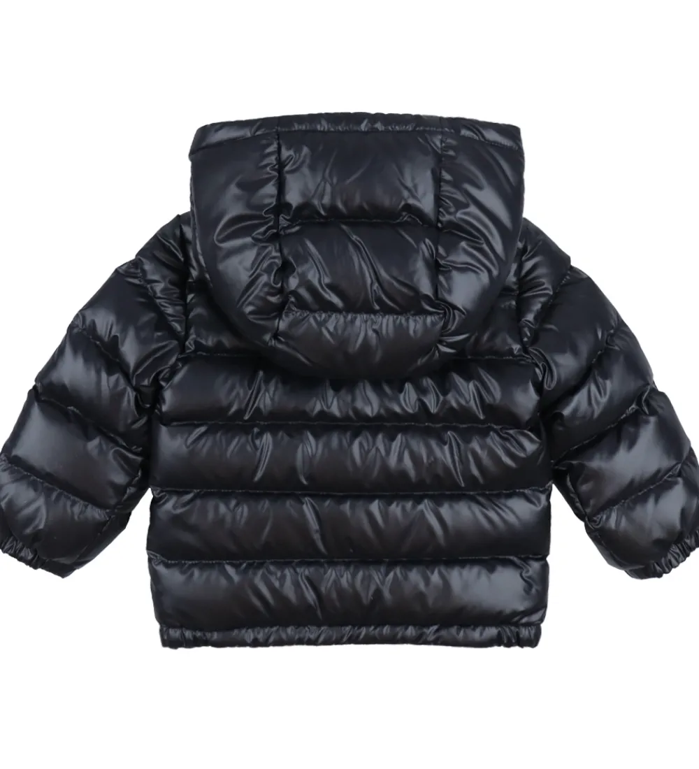 Lækker Moncler dunjakke i ensfarvet mørk navy i en glatvævet kvalitet, og øverst på venstre ærme sidder der et filt-mærke med et Moncler-logo.