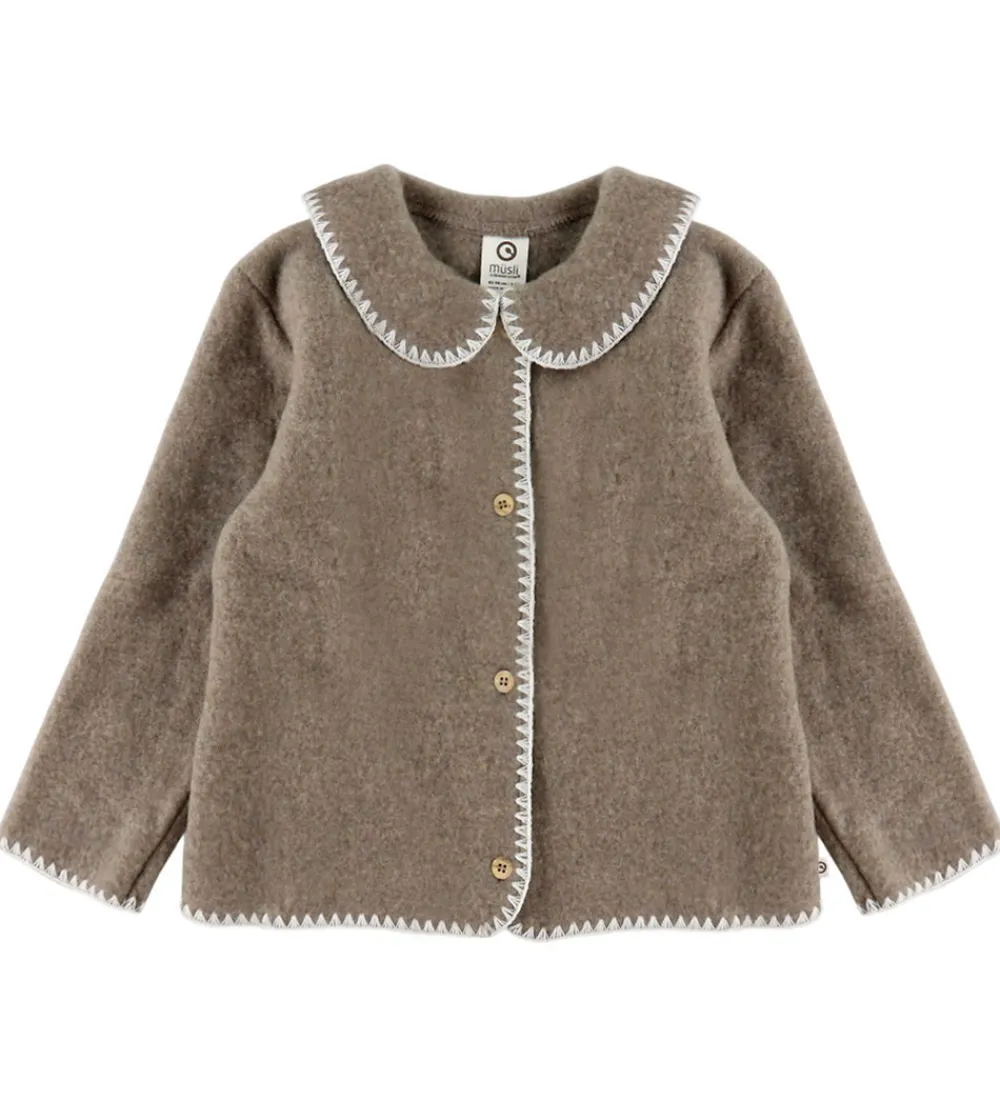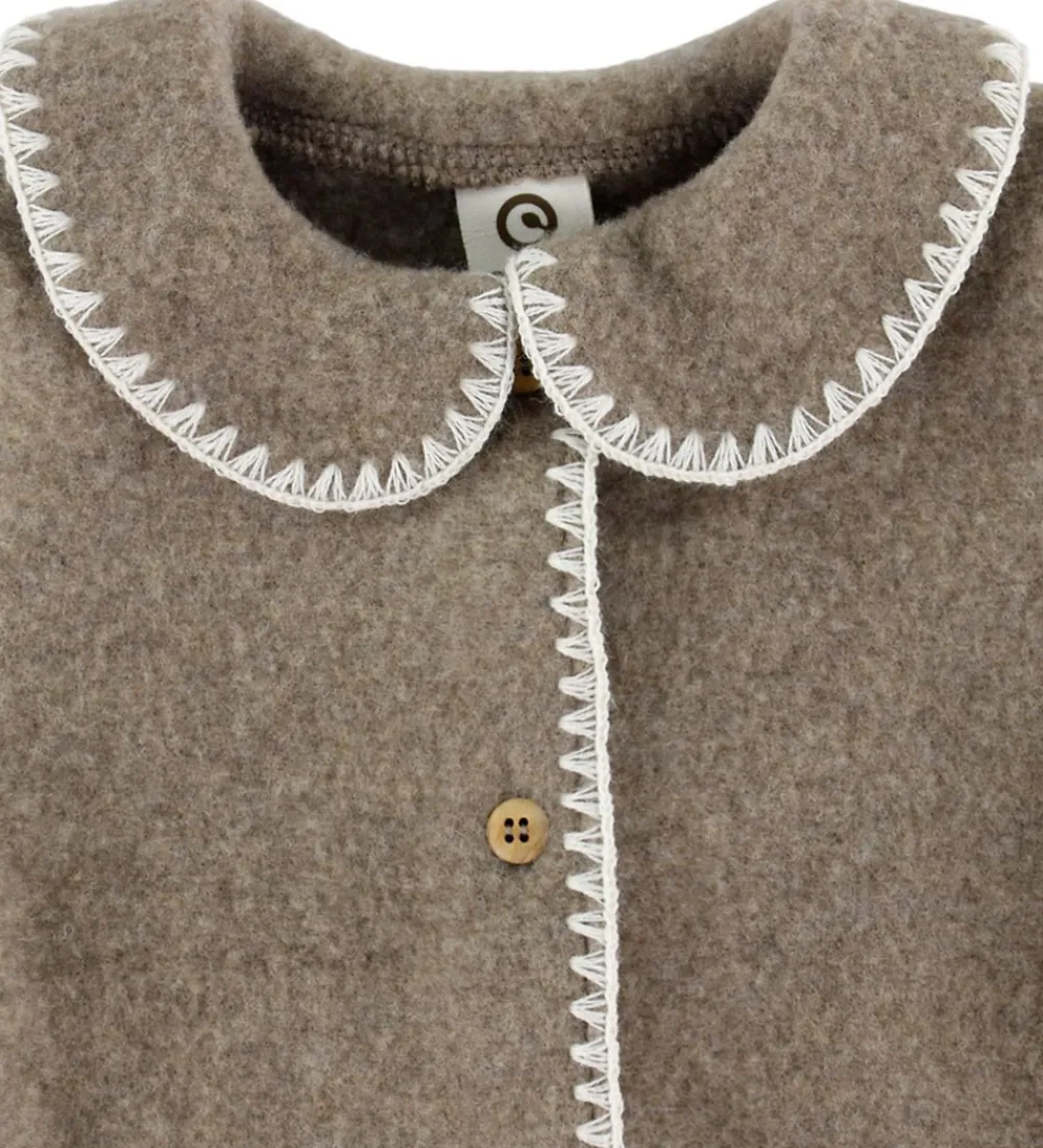 Flot cardigan fra Müsli af uldfleece i en ensartet, meleret brun farve med dekorative syninger langs kanterne.