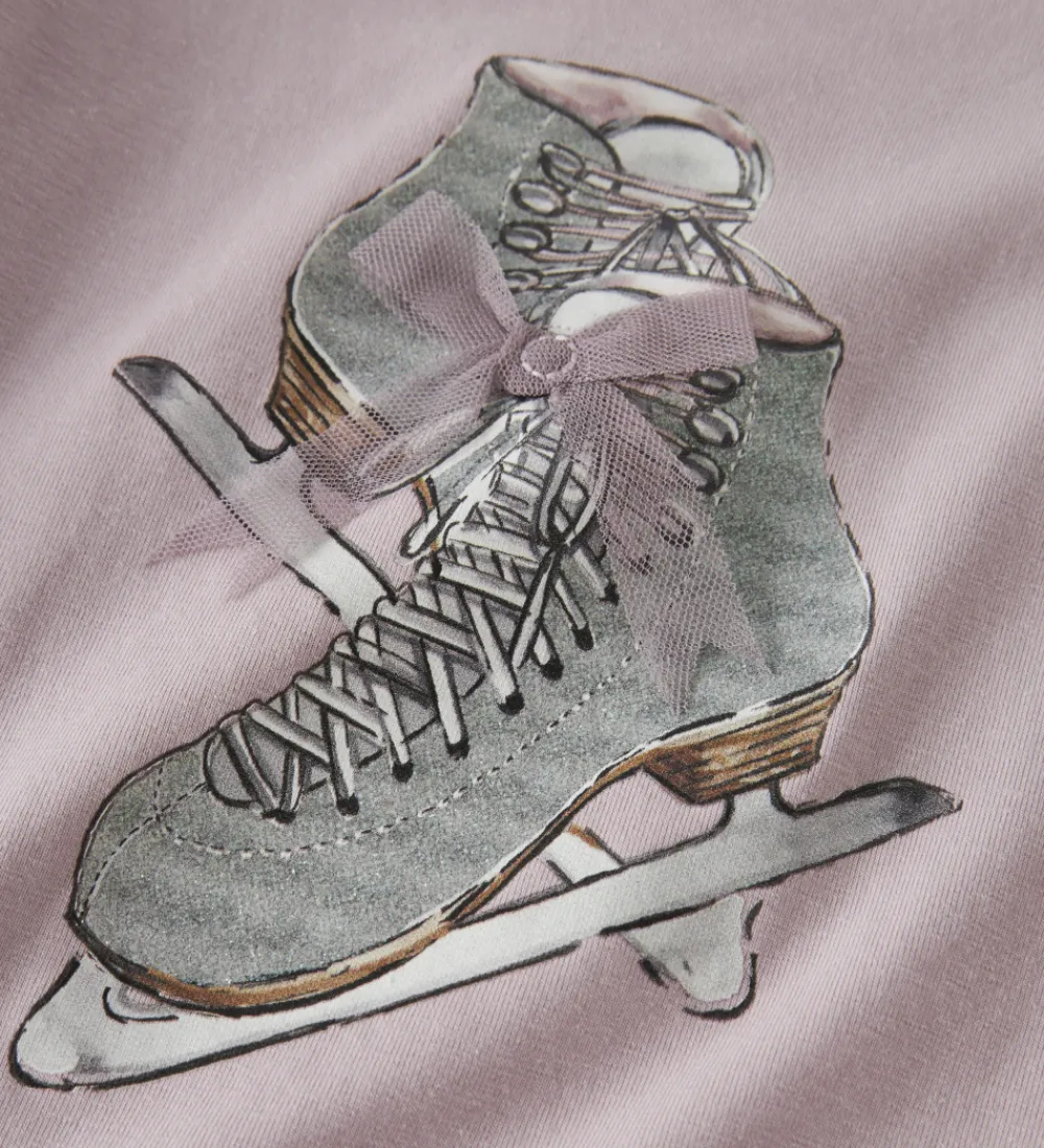 Chamerende Name It bluse i støvet lyselilla med print af et par skøjter med en detaljer i tyl. Blusen har en rund halsudskæring og lange ærmer med puf ved skuldrene.