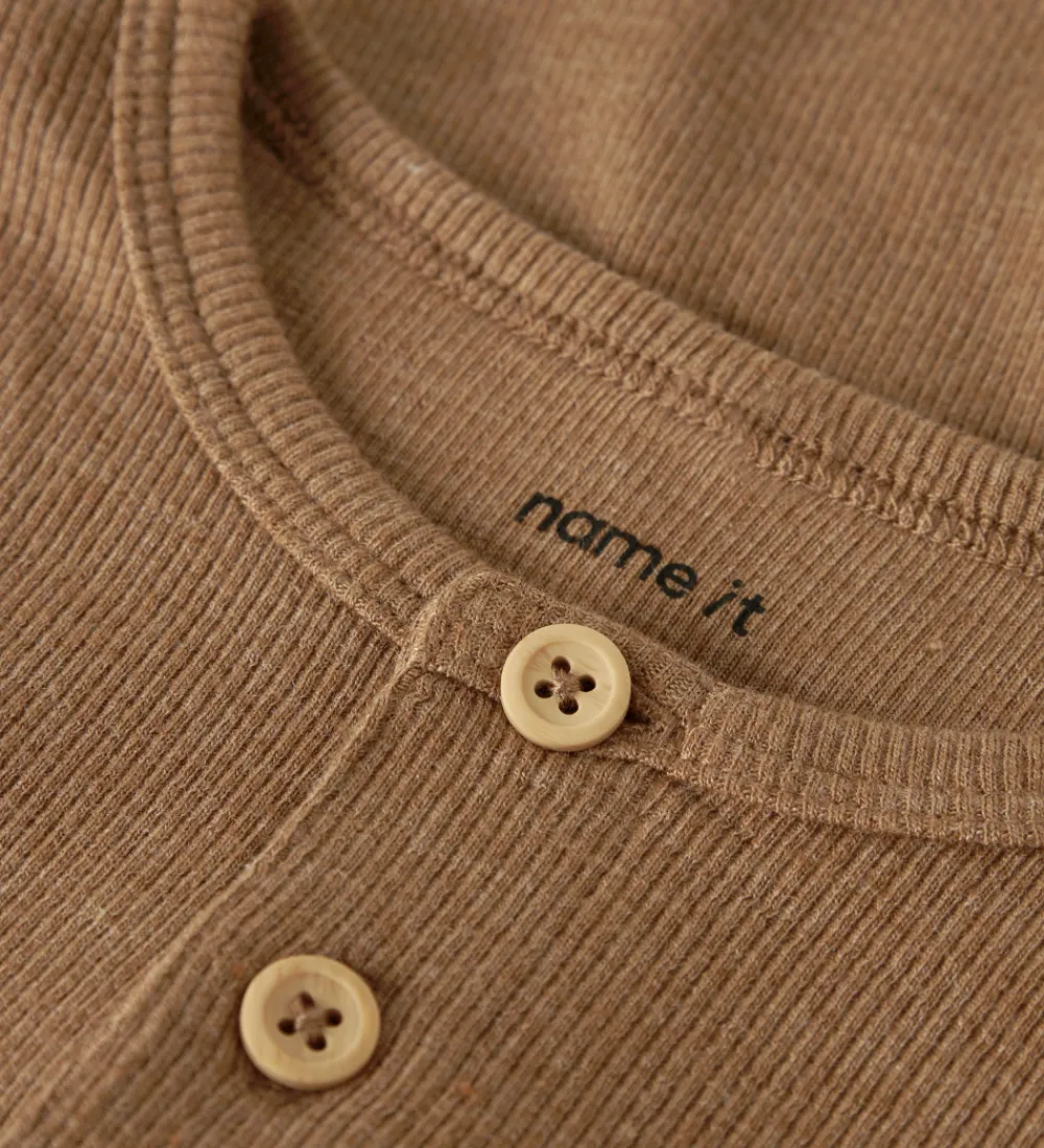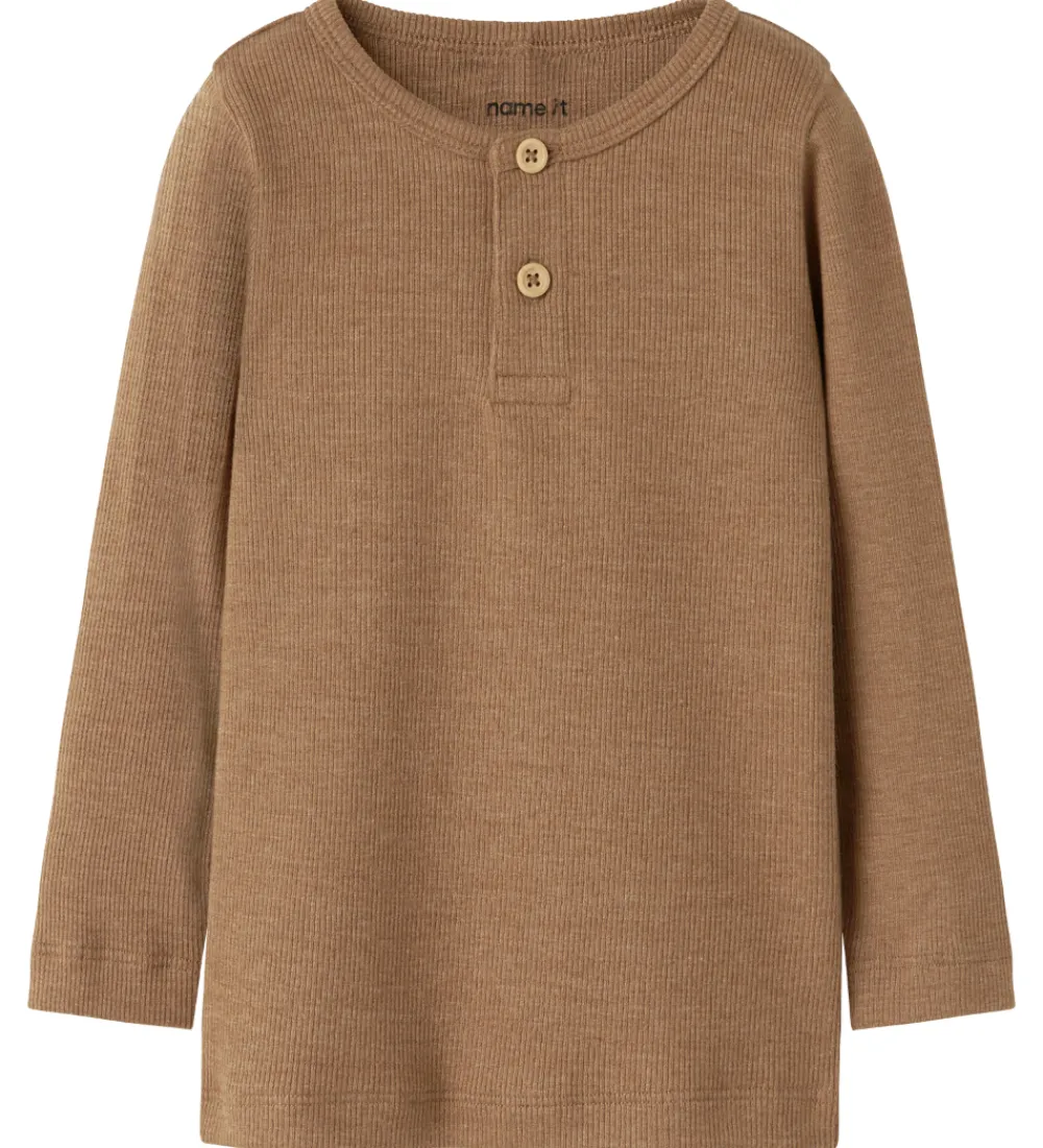 Flot Name It bluse i en varm brun nuance med ribstruktur. Blusen har to knapper fortil og lange ærmer.