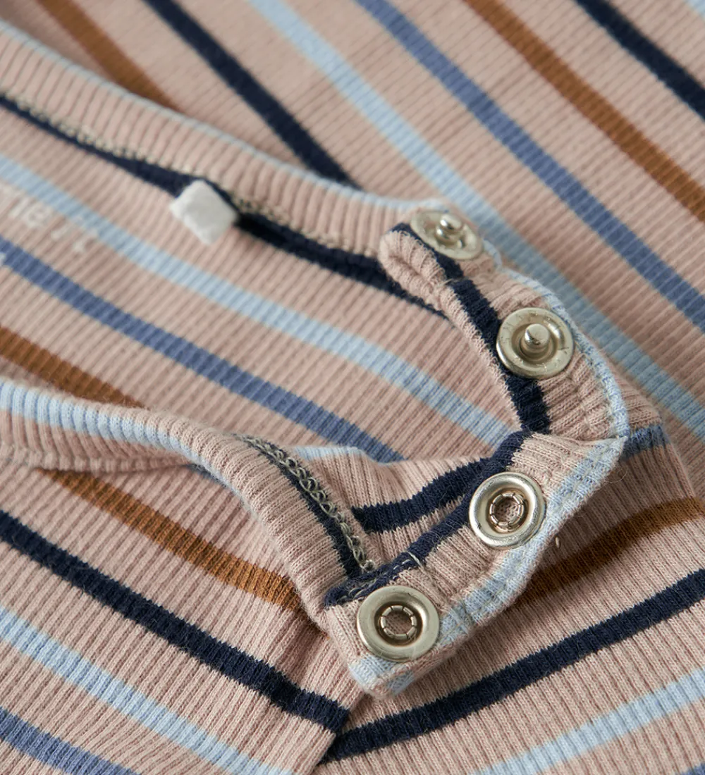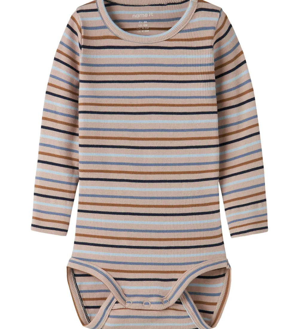 Elegant Name It body i beige med smalle striber i brun og tre brune nuance. Bodyen har ribstruktur, lange ærmer og trykknapper ved venstre skulder. Den lukkes med trykknapper mellem benene.