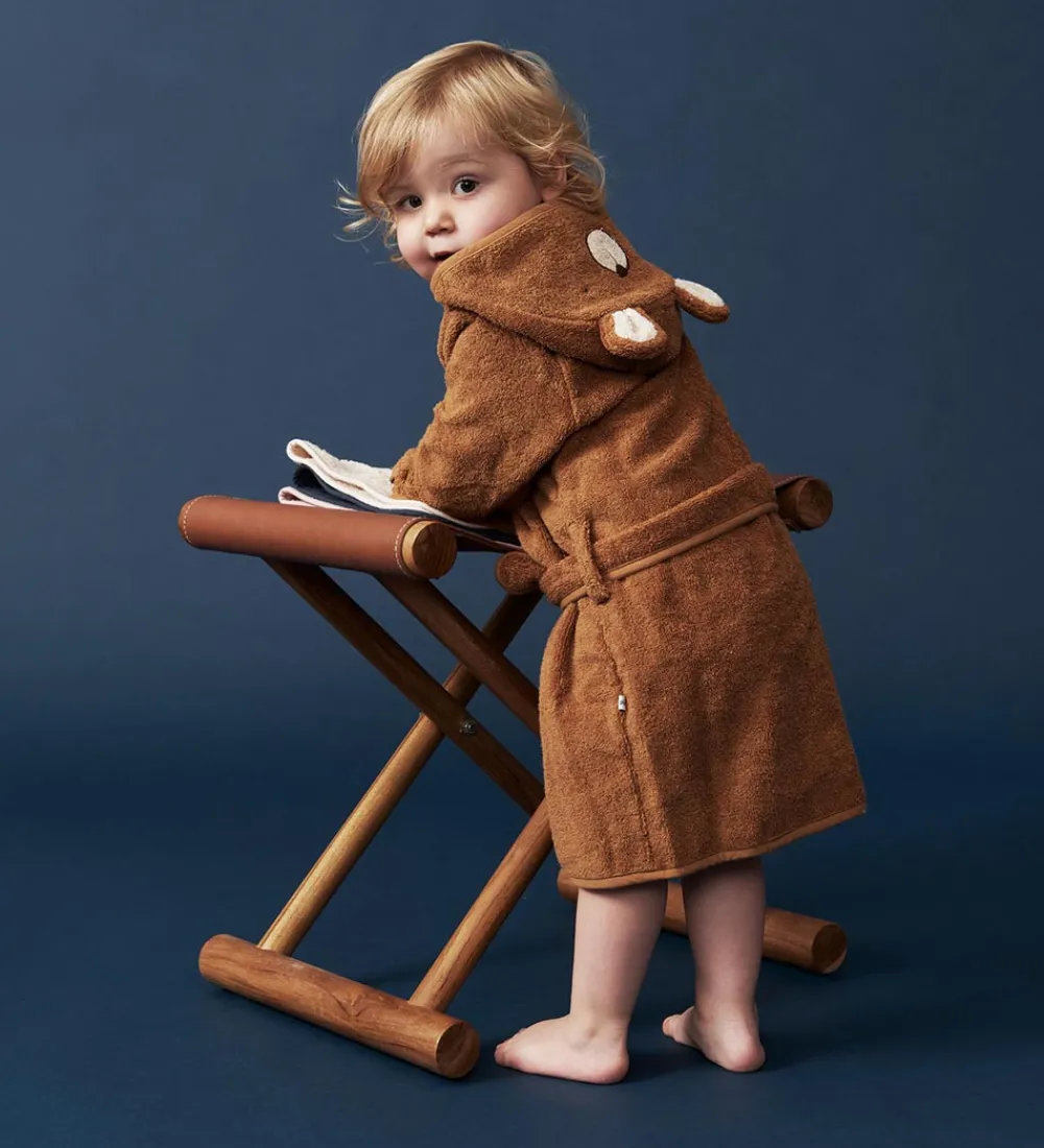 Smart Pippi Baby badekåbe i brun, med en fastsyet hætte udformet som en bjørn, med store ører.