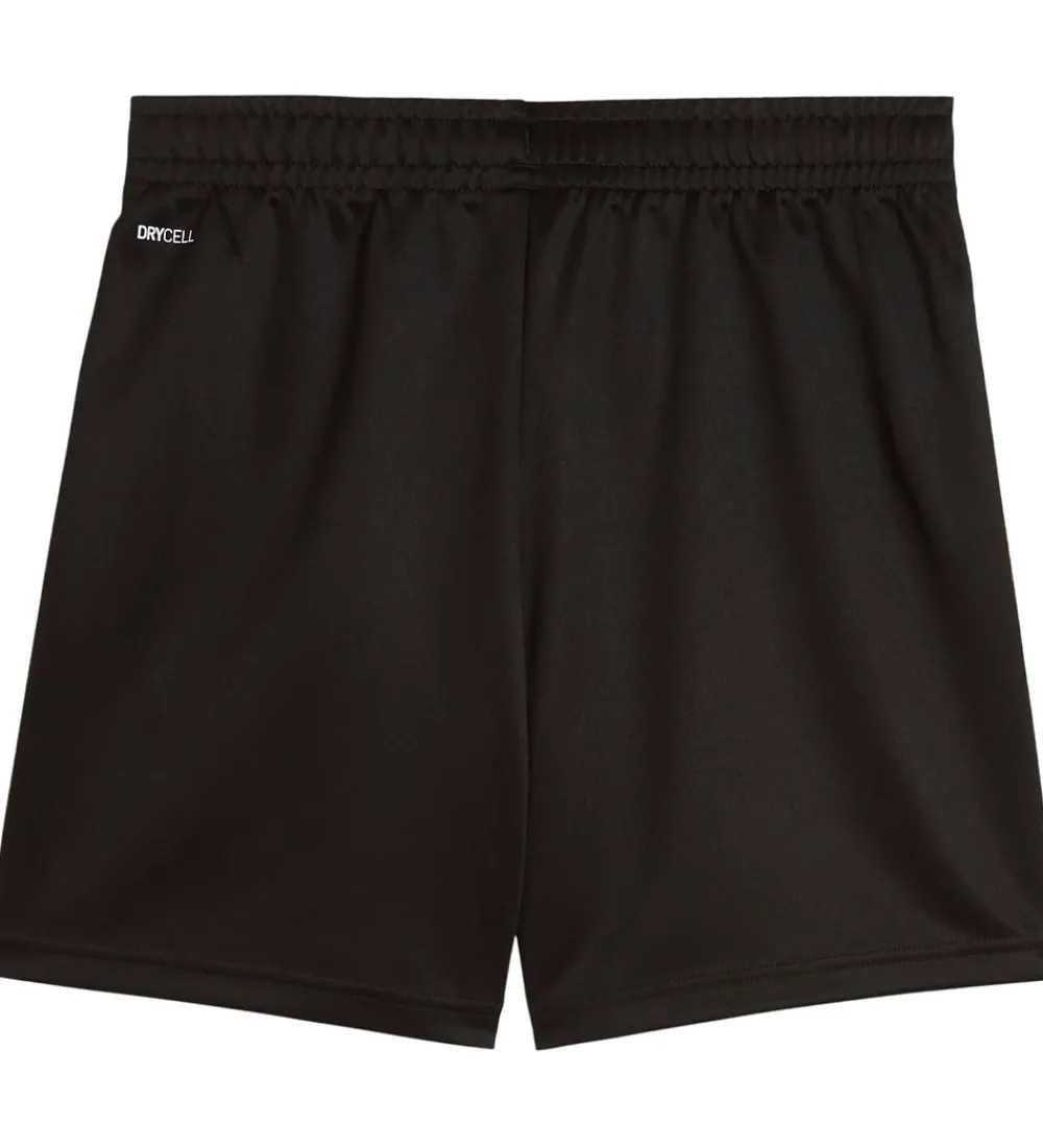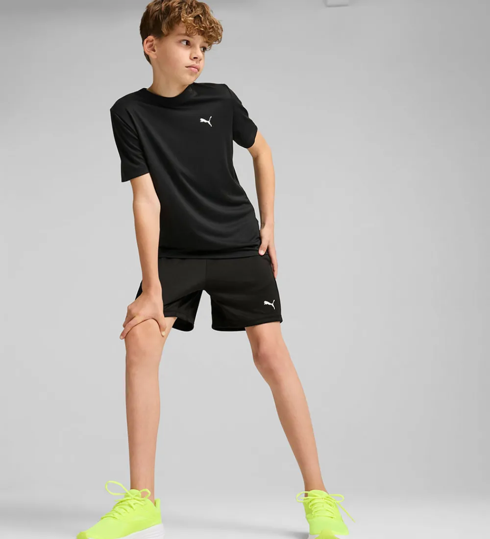 Praktiske Puma sportsshorts i ensfarvet sort med diskret, hvidt Puma-logo. Puma shortsene har en bred elastik i livet, som kan strammes ind med en snøre på indersiden. I siderne er der praktiske lommer.