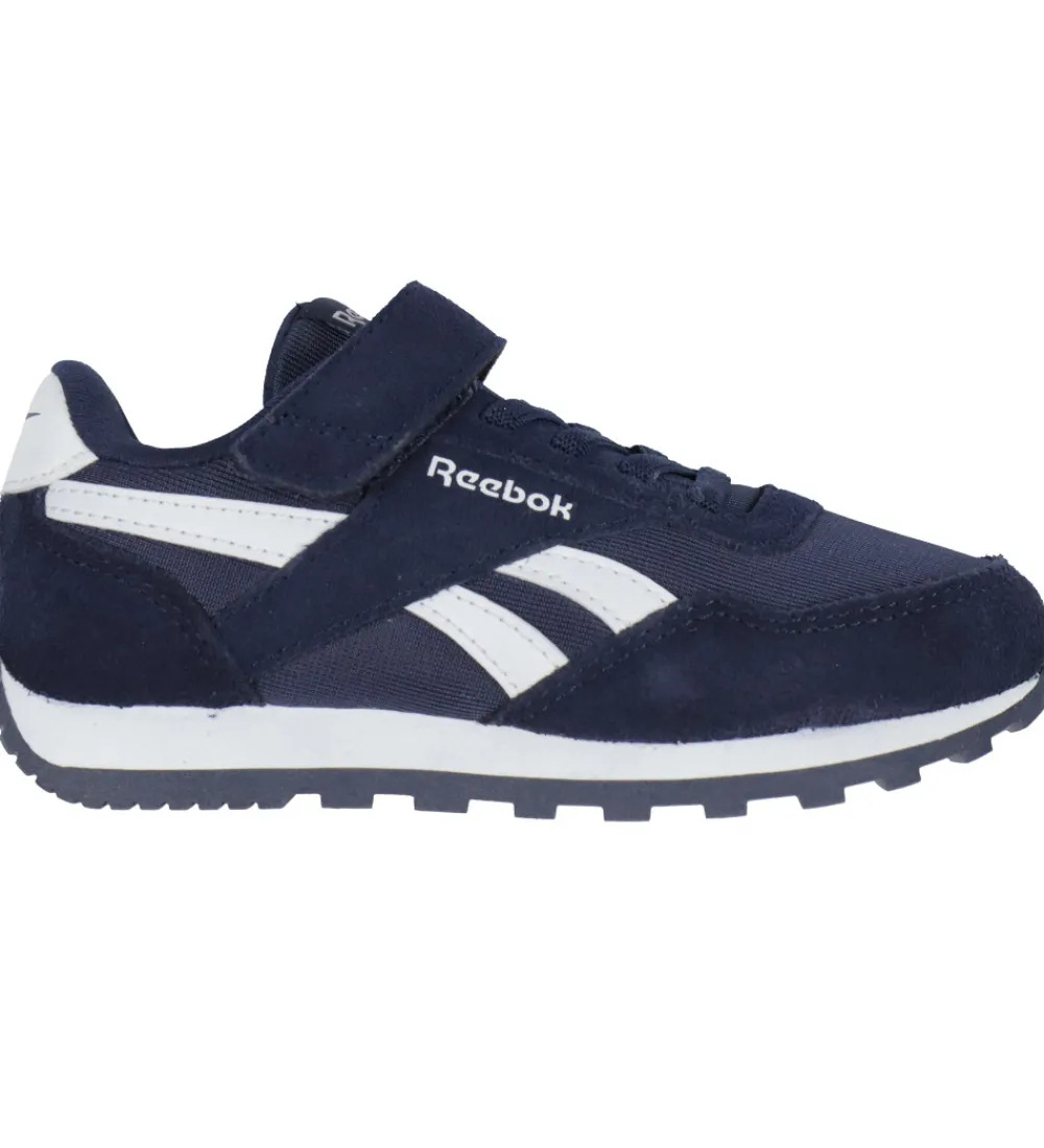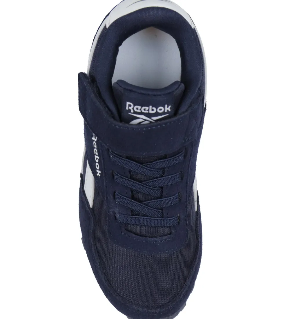 Stilfulde Reebok sko i navyblåt ruskind og tekstil med navyblå og hvide detaljer og logoer.