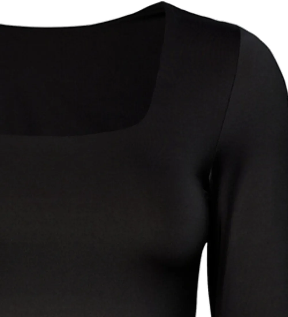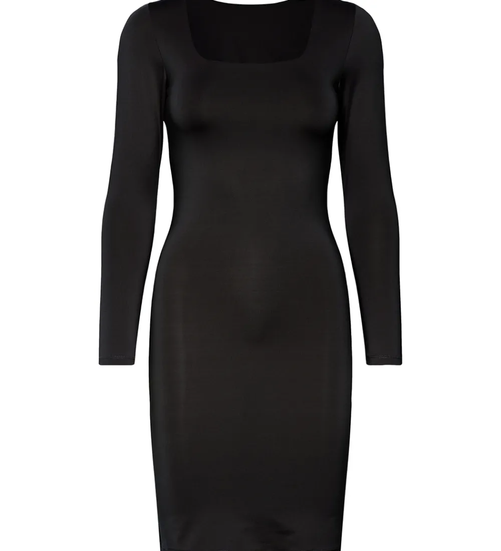 Elegant Rosemunde kjole i sort. Rosemunde kjolen har en firkantet halsudskæring. Kjolen har lange ærmer og en tætsiddende pasform. Kjolen er designet med et vendbart design, så man får den dybe udskæring i ryggen.