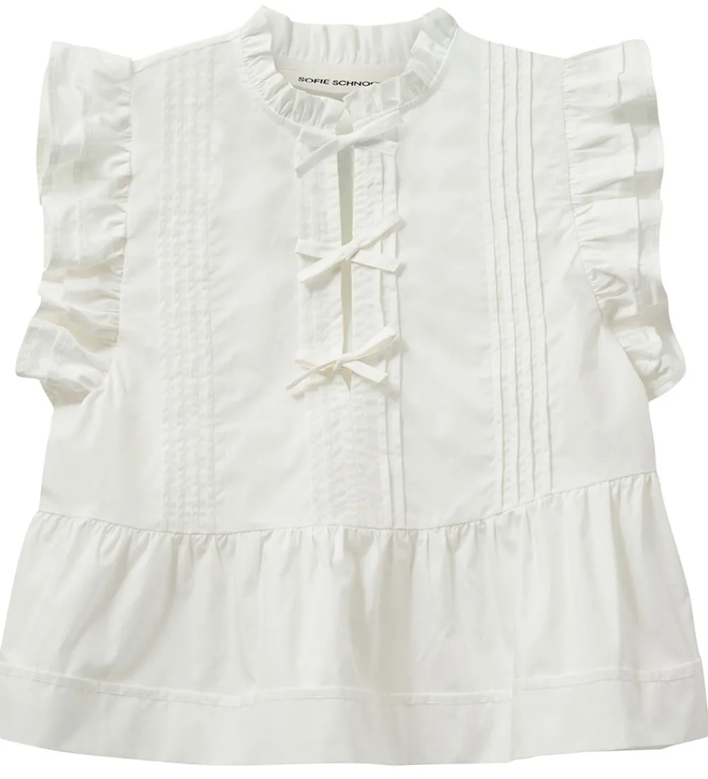 Smuk Sofie Schnoor top i hvid med mange fine detaljer, som smalle, lodrette læg, sløjfer og flæsekanter.
