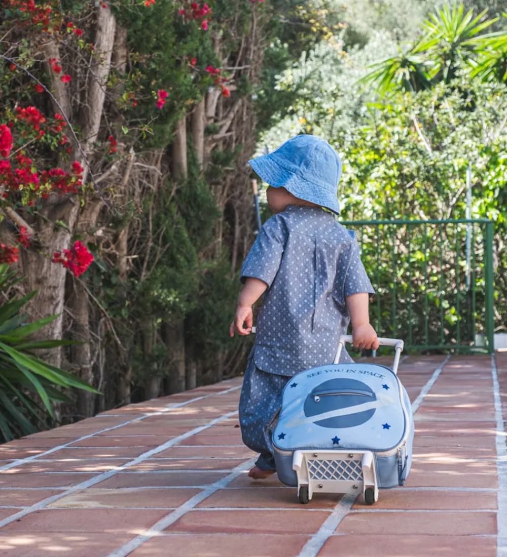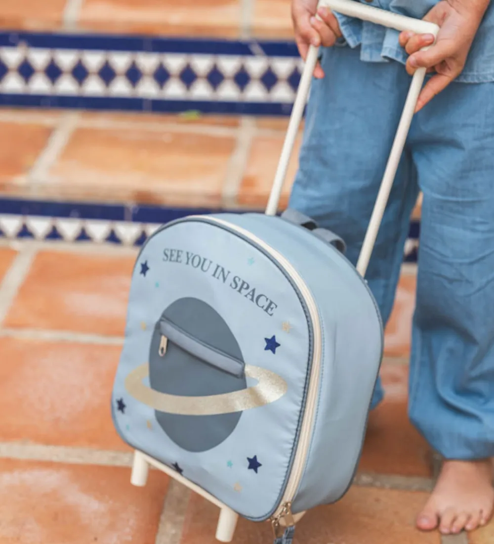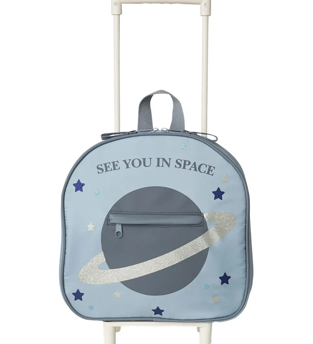 Skøn taske fra That’s Mine i en lys blå nuance med et print af en planet og teksten “SEE YOU IN SPACE” med detaljer i blå nuancer og sølvglimmer.