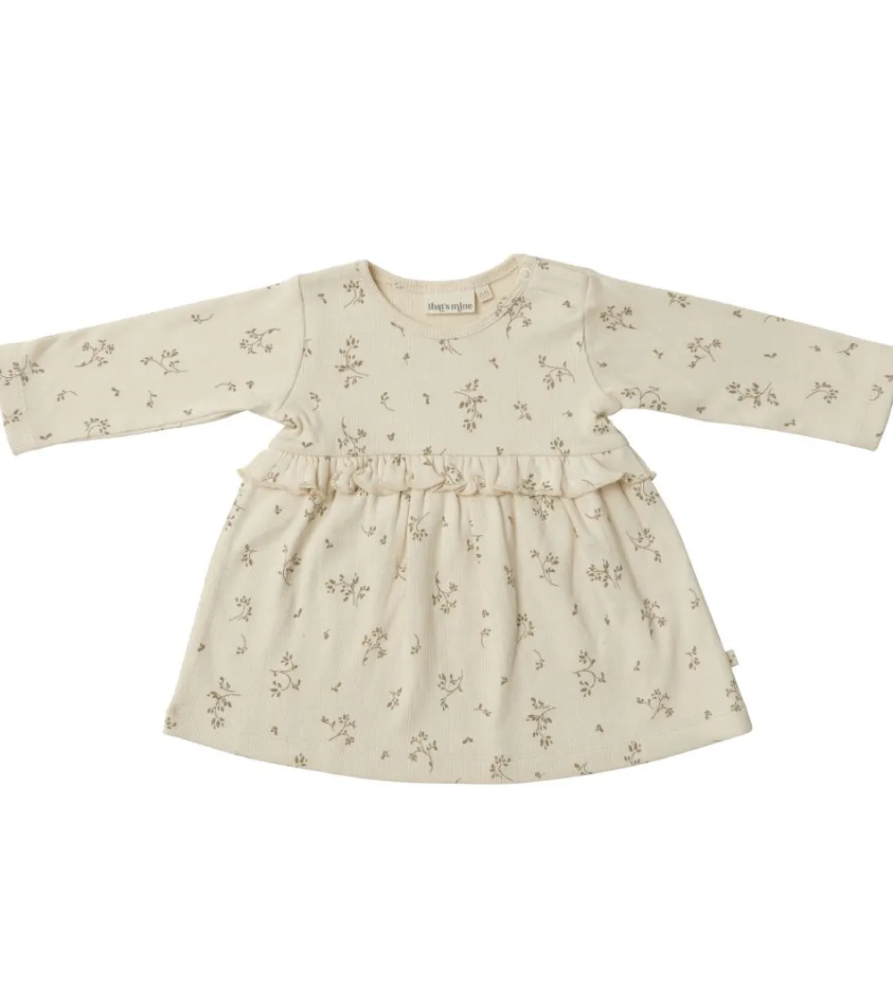 That’s Mine tunikaen har lange ærmer og en rund halsudskæring. På venstre skulder er der en trykknap, så der let kan tages af og på. I livet er der en lille syning samt en flæse, hvor kjolen bliver til skørt, som går ud i fine folder.