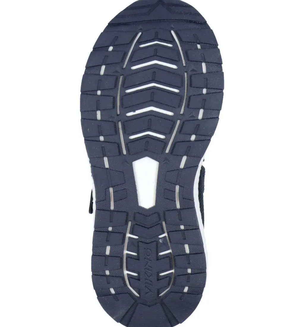 Viking skoene lukkes med velcroremme over vristen. Bagpå er der en praktisk strop og støttende hælkappe. Indvendigt er der blåt tekstil og udtagelige indersåler. Ydersålerne er letvægtige og fleksible, og har et praktisk skridmønster under bunden, som sikrer et godt fodfæste.