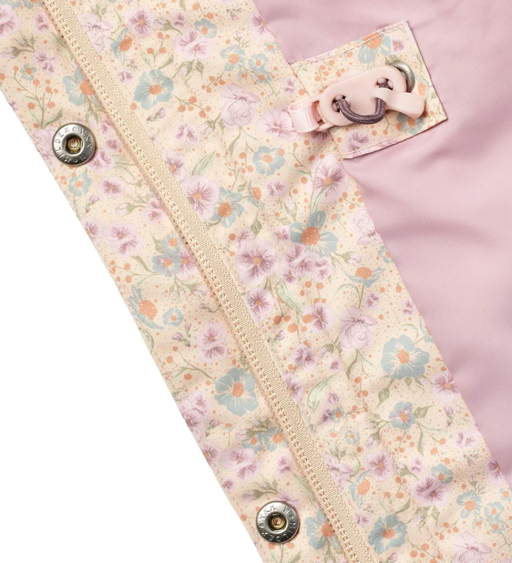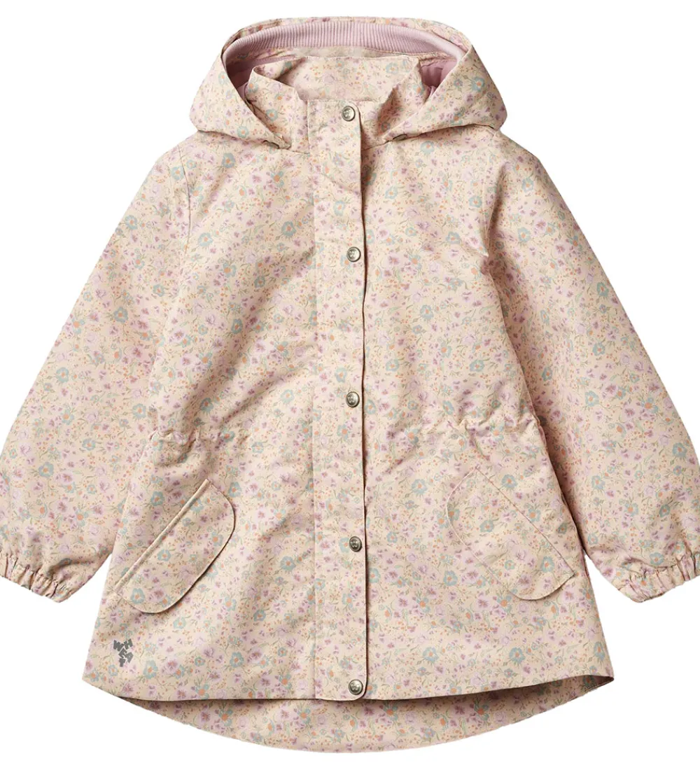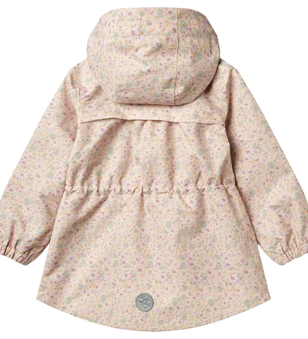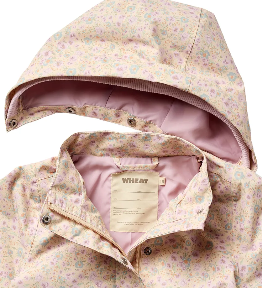 Wheat sommerjakken har en aftagelig hætte, som sidder fast med trykknapper. I toppen kan den justeres med velcro, og i ansigtsåbningen har den en bred ribkant. Ærmerne har elastikkanter. I taljen kan den strammes ind med en elastiksnøre på indersiden, så den får en flot, figursyet facon.