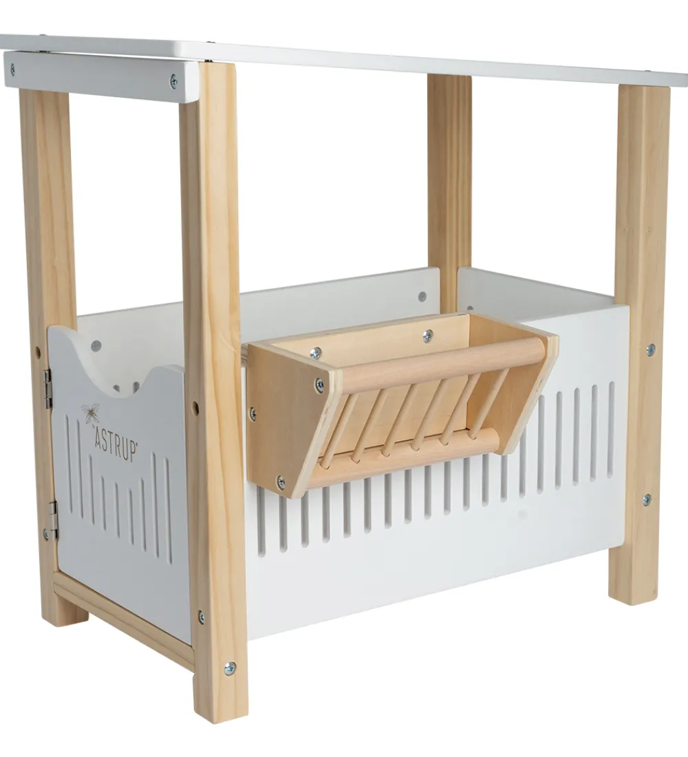 by Astrup hestestalden har en firkantet facon med et tag og en dør som kan åbnes. På den ene side er der et udhæng på ydersiden, hvor man kan placere mad til hesten. Hestestalden passer til en by Astrups krammepony på 30 cm.