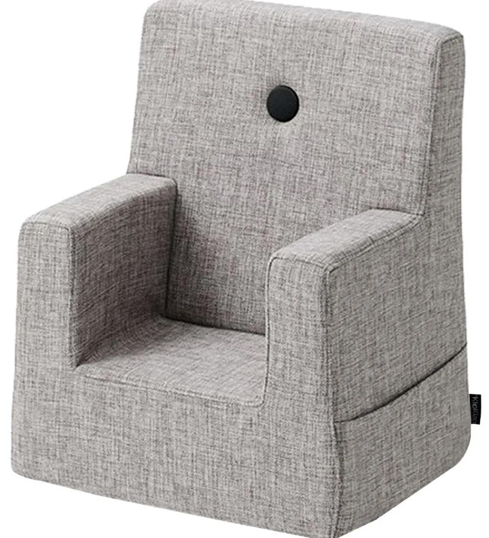 by KlipKlap børnestolen har form som en lænestol med et højt ryglæn og behagelige armlæn. Den er ergonomisk udformet til børn, så den giver god støtte til ryggen og benene. I venstre side er der en praktisk lille lomme til bøger, legetøj eller andre sager.