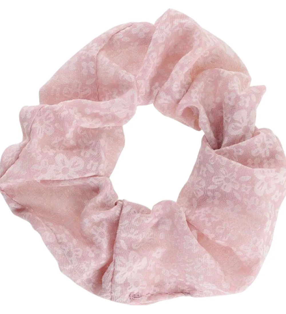 Fin By Stær scrunchie i en lys rosa nuance med et diskret blomstermønster. By Stær scrunchien er perfekt til at pifte frisuren op.