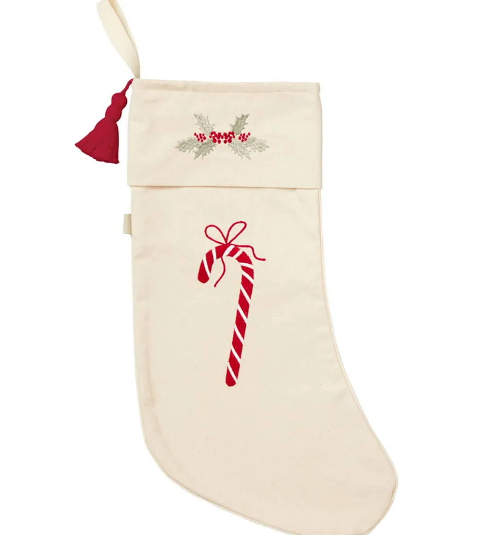 Smuk Cam Cam Copenhagen julesok i naturfarve med farverige broderier af en engel, en julestok og kristtorn.
