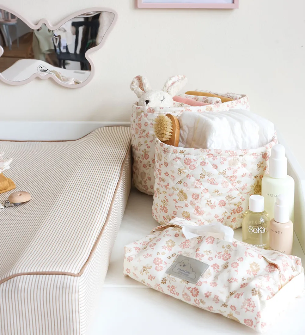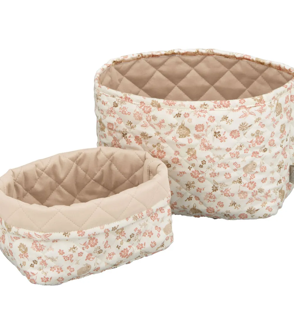 Skønne Cam Cam Copenhagen opbevaringskurve, der på den ene side er i en cremehvid farve med et sødt blomster- og kaninprint i rosa og beige, og på den anden side er i ensartet beige. Opbevaringskurvene er med en quiltet struktur, og kanten kan foldes ned for at give et flot look.