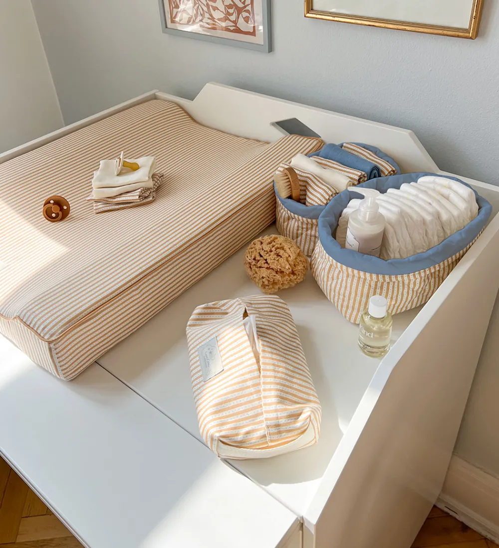 Skønne Cam Cam Copenhagen opbevaringskurve, der på den ene side er med lysebrune og hvide striber samt lyseblå, små prikker, og på den anden side er i ensartet lyseblå. Opbevaringskurvene er med en quiltet struktur, og kanten kan foldes ned for at give et flot look.