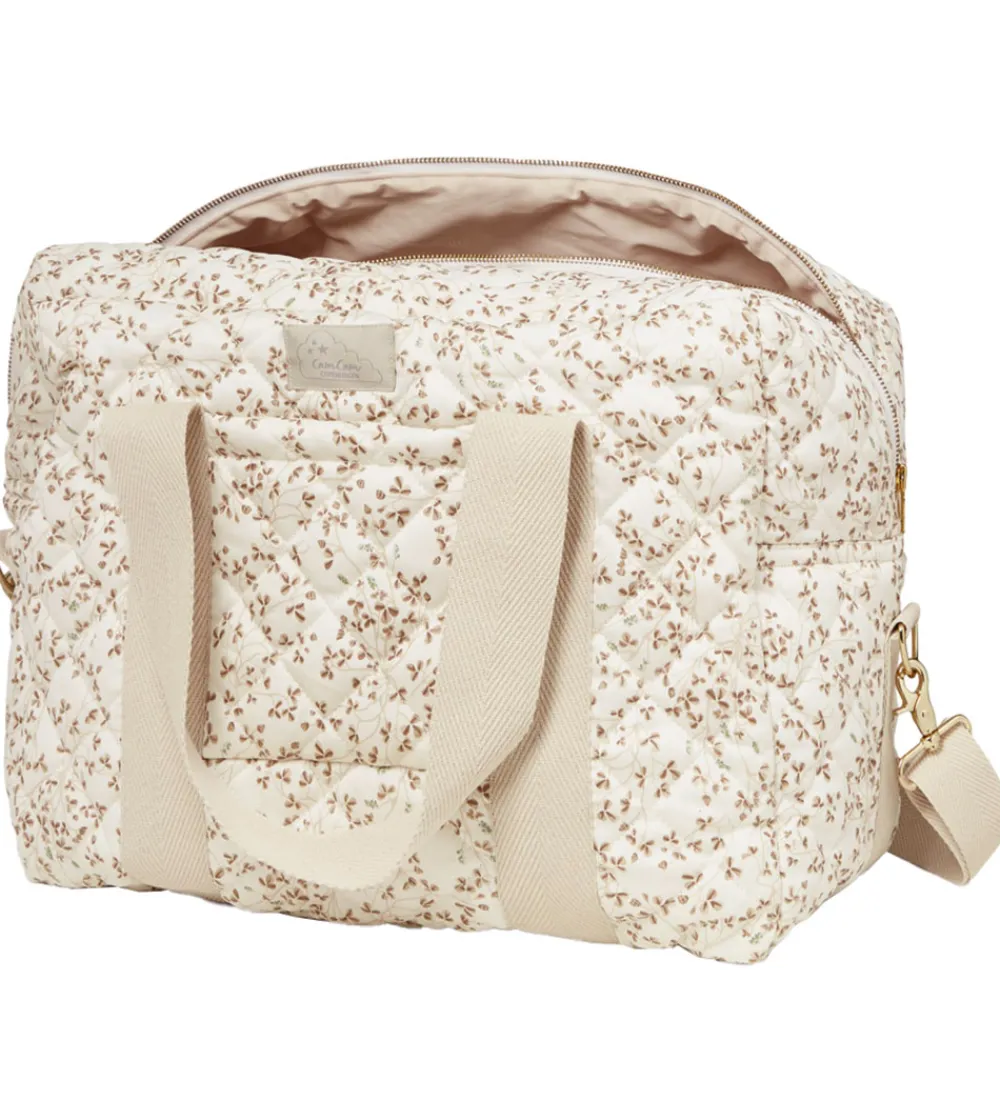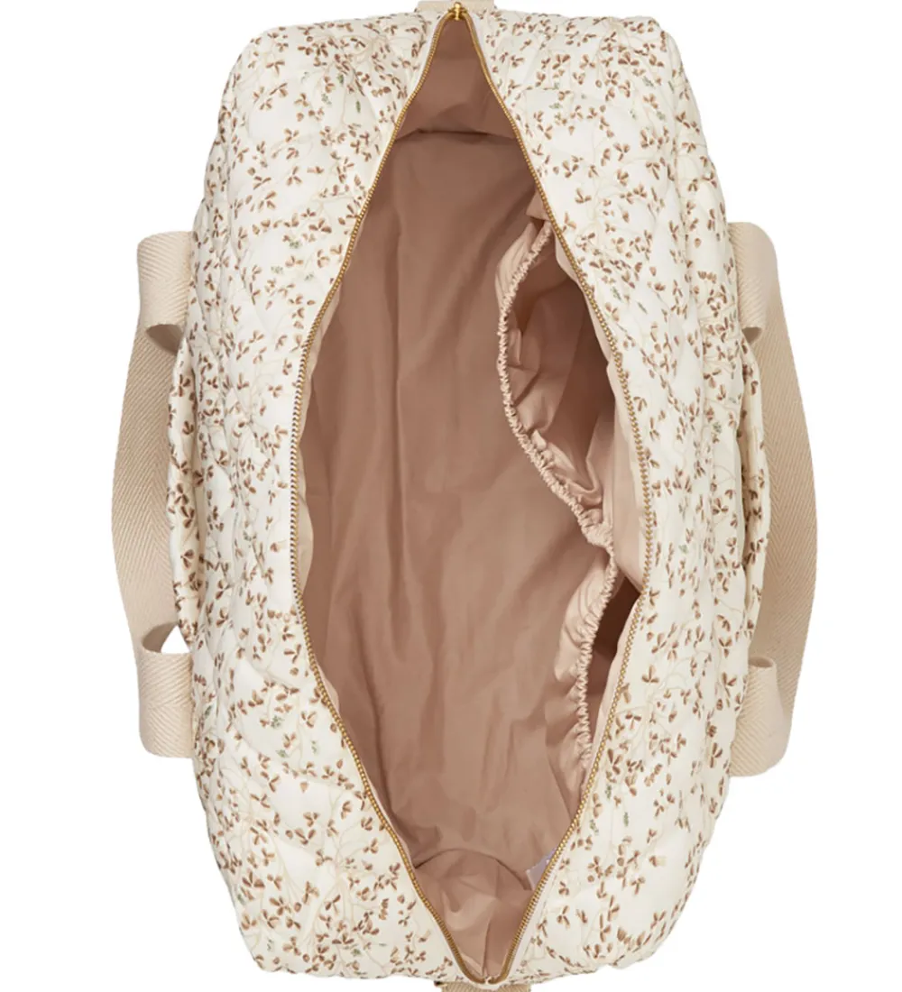 Flot Cam Cam Copenhagen pusletaske i beige med et allover blomsterprint i brune nuancer. Pusletasken har en quilted struktur, og den har lysebrune remme og for samt guldfarvede metalspænder og lynlås.