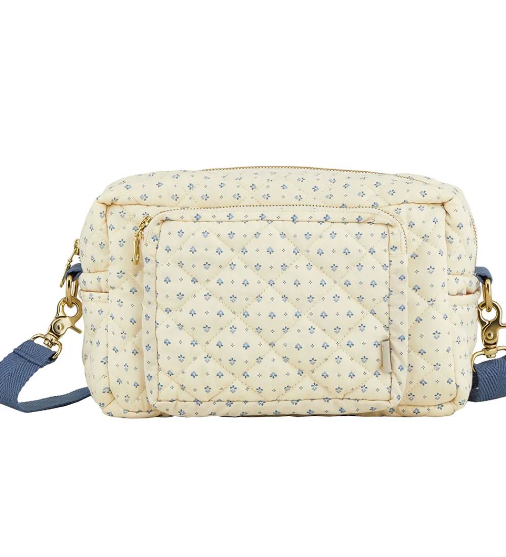 Flot Cam Cam Copenhagen pusletaske i beige med et alloverprint af fine, små blomster i blå nuancer og med en quilted struktur. Pusletasken har blå remme, guldfarvede metalspænder og lynlås.