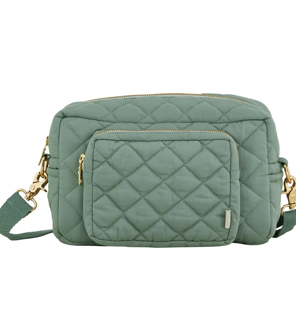 Flot Cam Cam Copenhagen pusletaske i støvet grøn med en quilted struktur. Pusletasken har guldfarvede metalspænder og lynlås.
