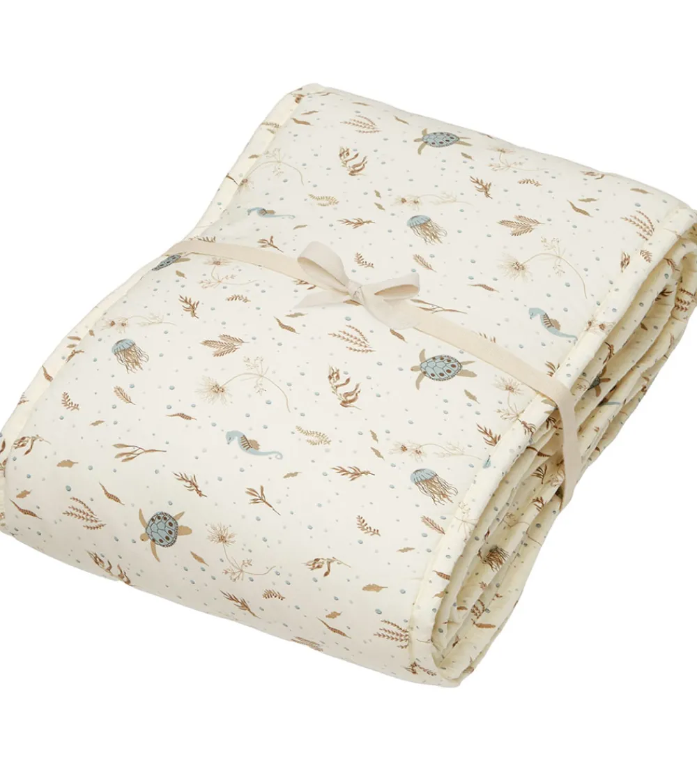 Fin Cam Cam Copenhagen sengerand i hvid med et smukt alloverprint af havdyr og -planter i brun og støvet blå.