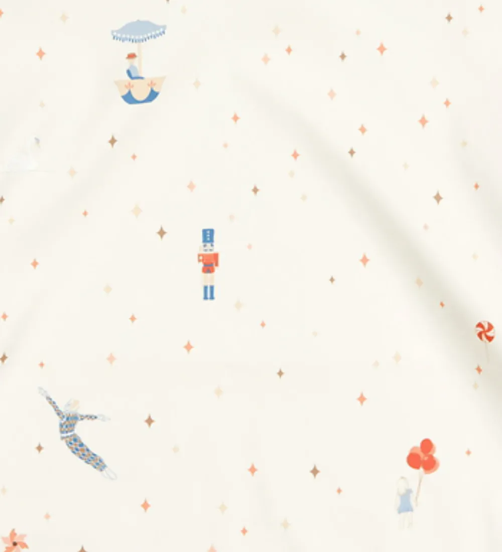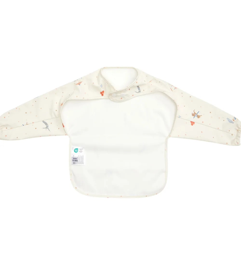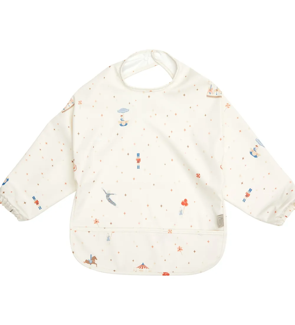 Fin Cam Cam forklæde i hvid med cirkusprint. Forklædet har en praktisk opsamlingslomme og lange ærmer. Den lukkes i nakken med en trykknap med to forskellige indstillinger. Forklædet er let at tørre af med en fugtig klud, og tåler at blive vasket i vaskemaskinen ved 40 grader.