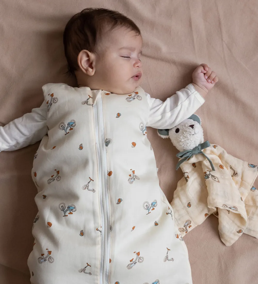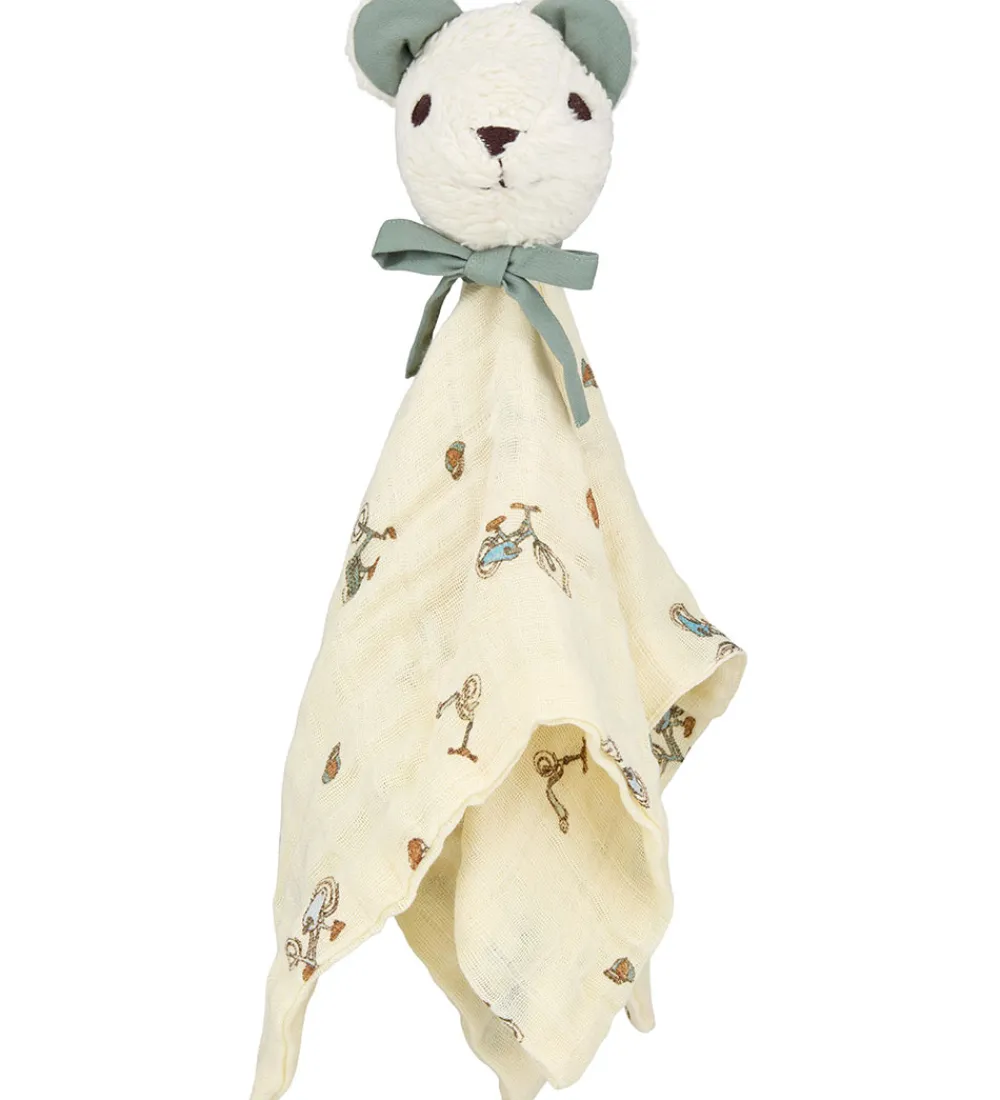 Sød Cam Cam Copenhagen nusseklud i beige med et alloverprint af fine, små cykler i blå, grønne og brune nuancer samt med et hvidt bjørnehoved og med ører og en butterfly i støvet grøn.