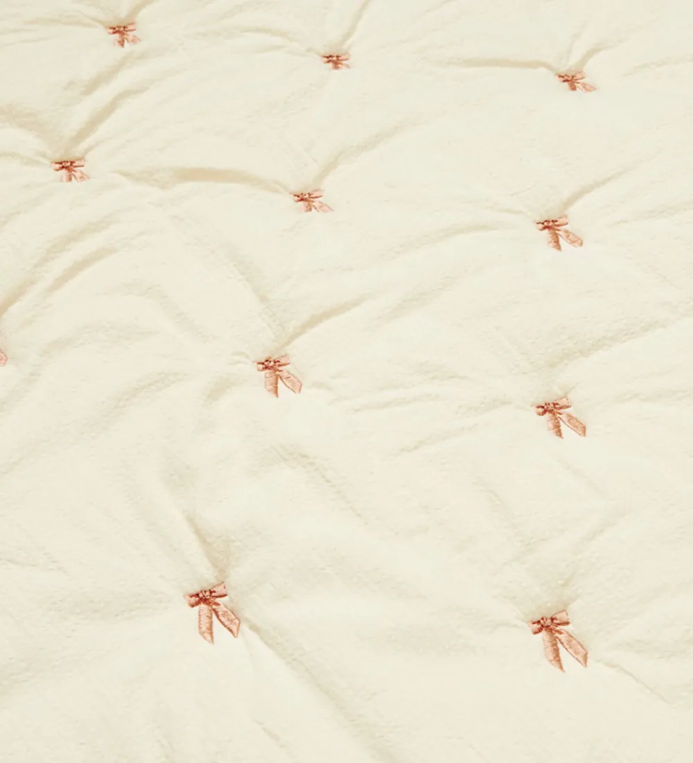 Skønt Cam Cam Copenhagen tæppe i lys rosa med rosa sløjfer. Tæppet har dekorative pomponer i hjørnerne, der giver et legende udtryk. Perfekt til ethvert børneværelse.