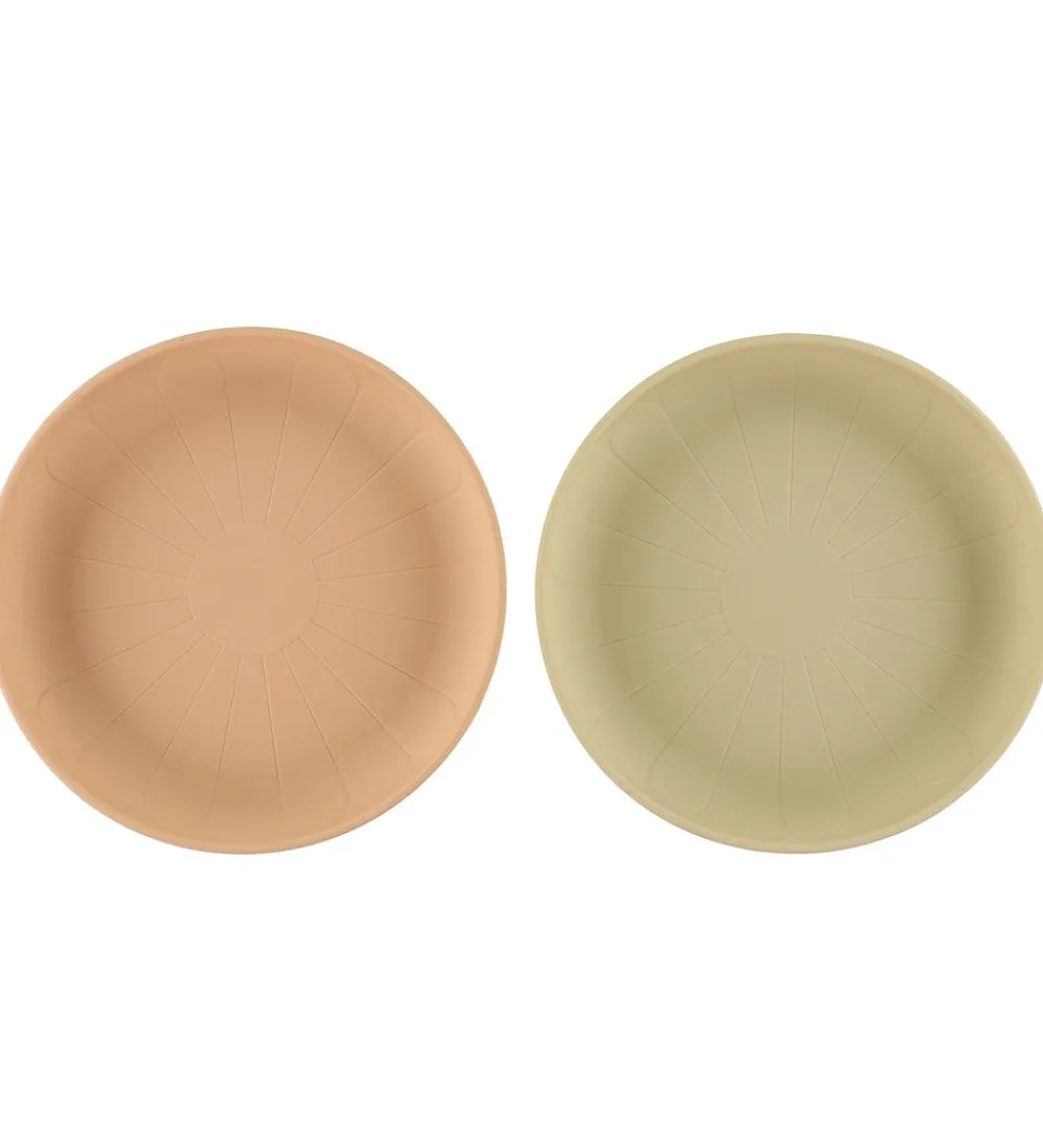 Praktiske Cam Cam Copenhagen tallerkener solgt i en 2-pak, med en i støvet rosa og en i beige, begge med et blomster design i materialet på indersiden.