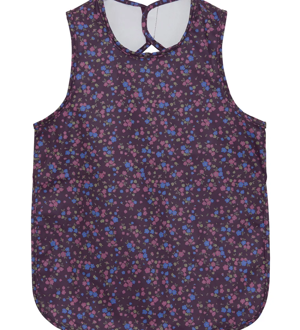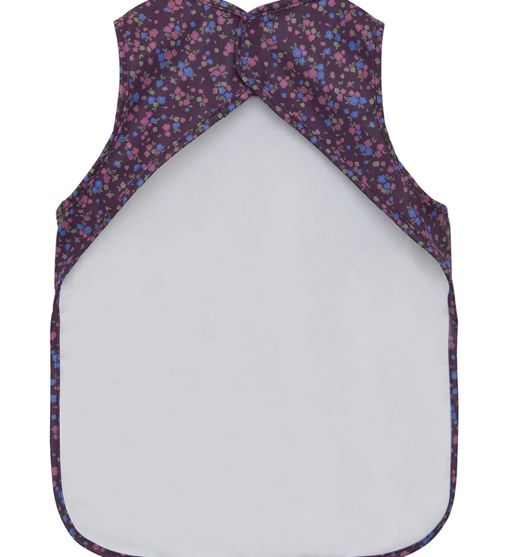 Sødt CeLaVi forklæde i lilla PU med et blomsterprint i rosa og lilla.