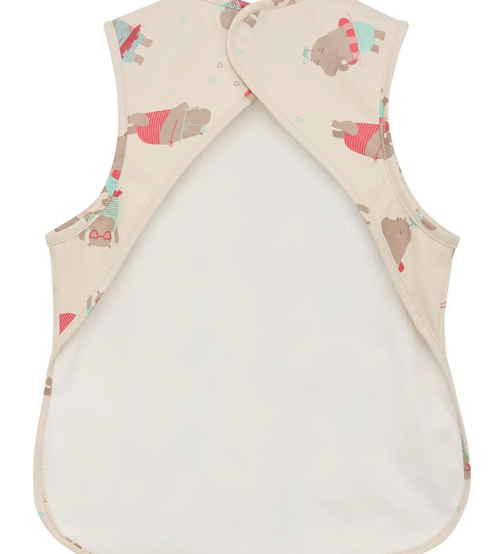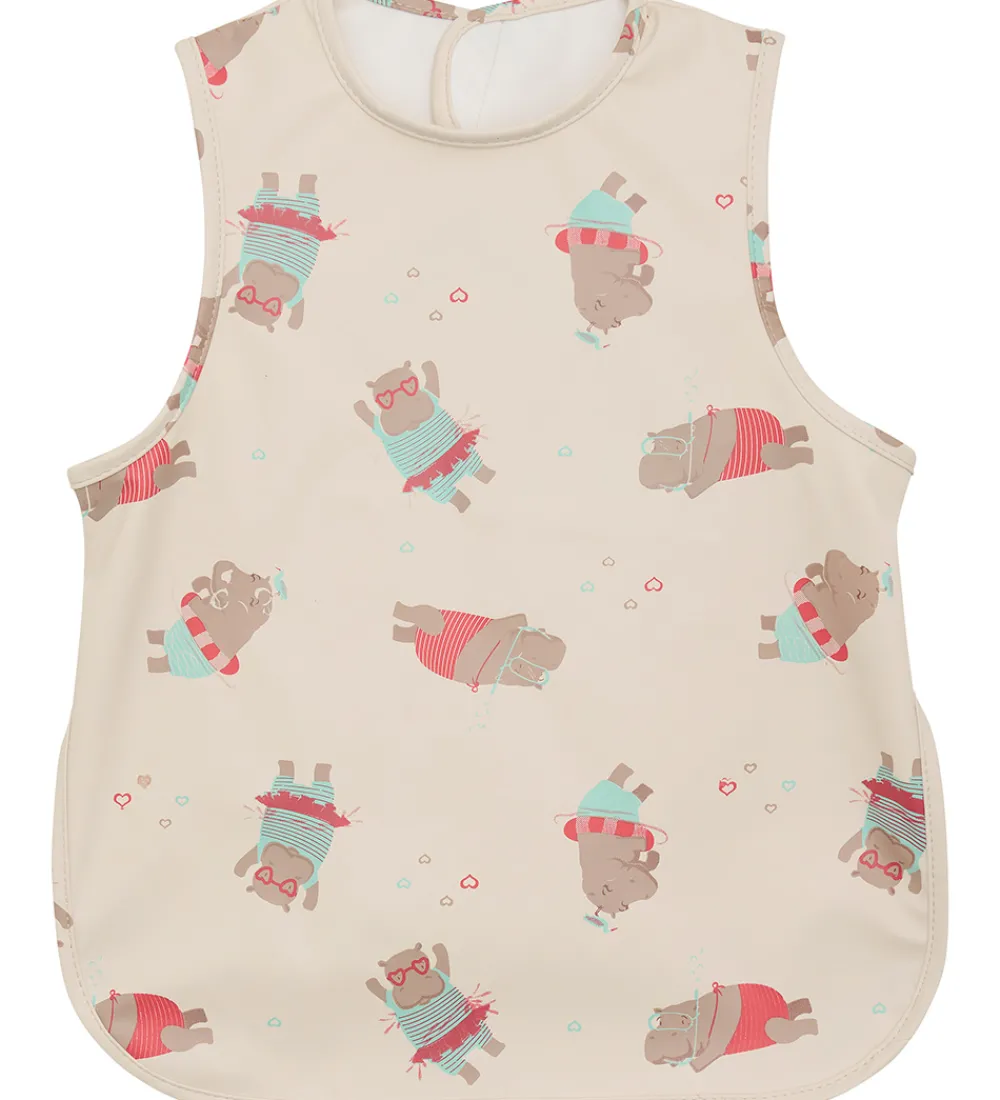 Smart CeLaVi forklæde i beige med et alloverprint med brune, røde og turkis farver, der forestiller flodheste i badetøj.