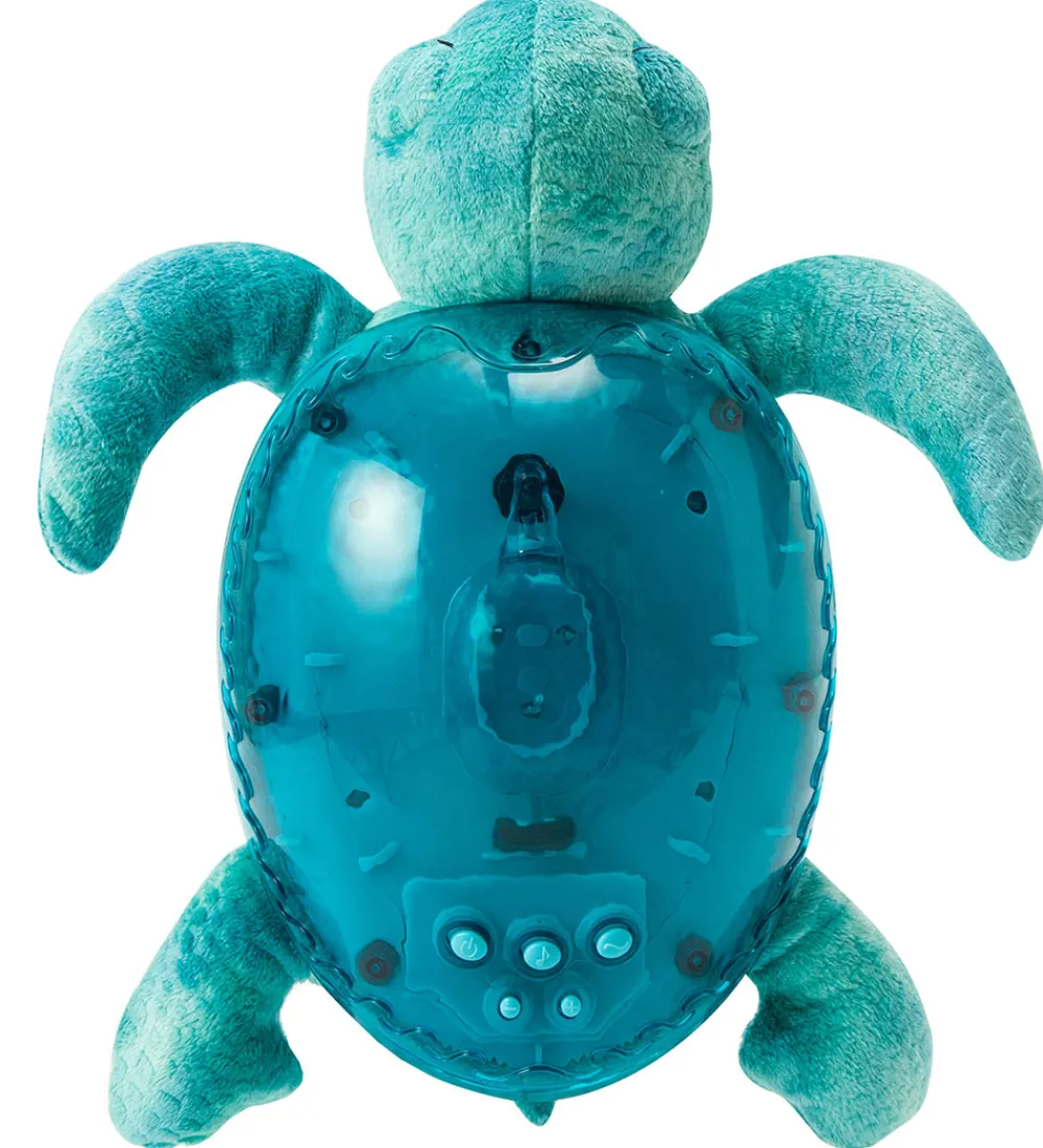 Under bunden har skildpadden en flap, der åbnes med velcro. Herunder er hoved tænd/sluk-knappen samt et rullehjul der styrer lysstyrken, så den kan justeres efter behov.