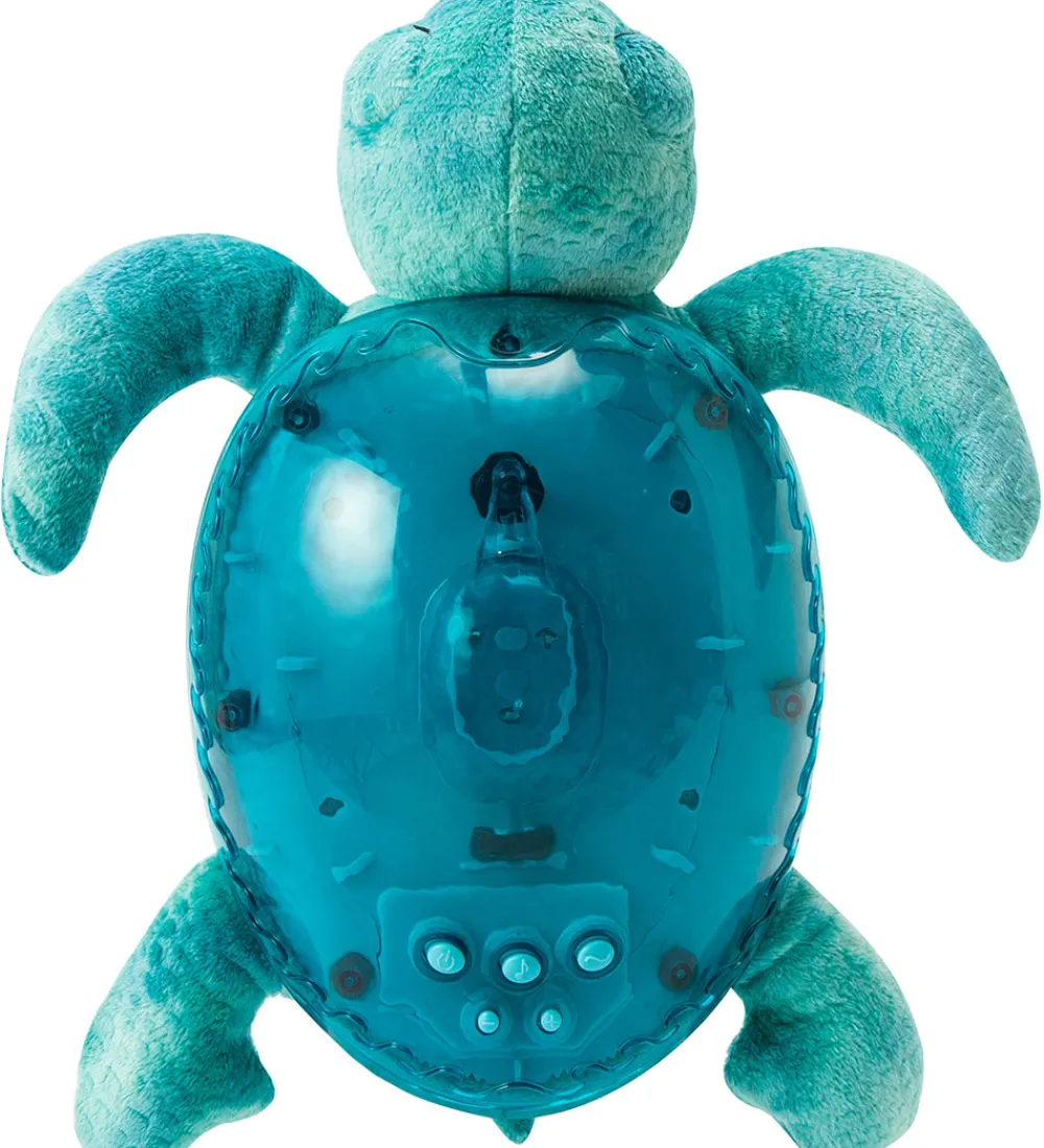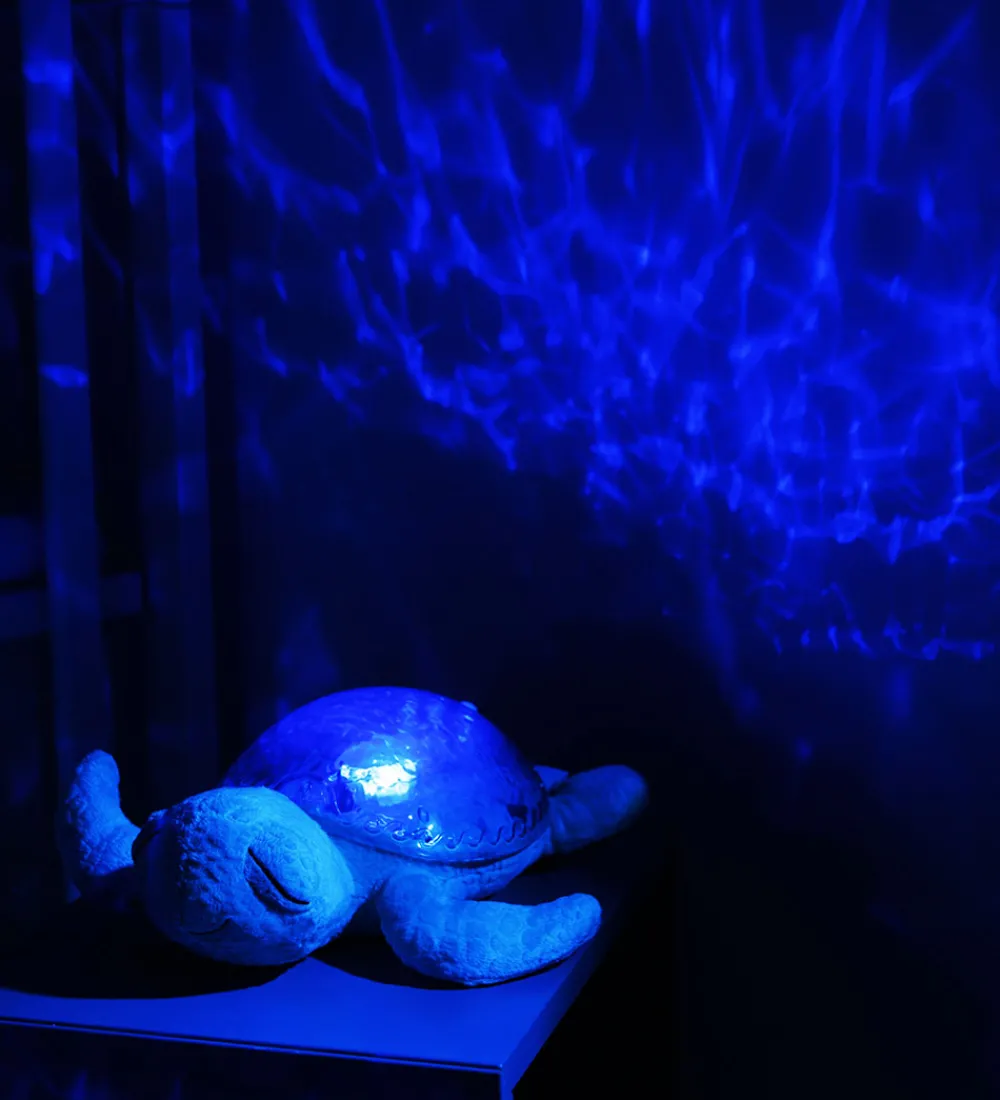 Sød Cloud-B natlampe formet som havskildpadde med et turkis, semitranparent skjold og en turkis krop.
