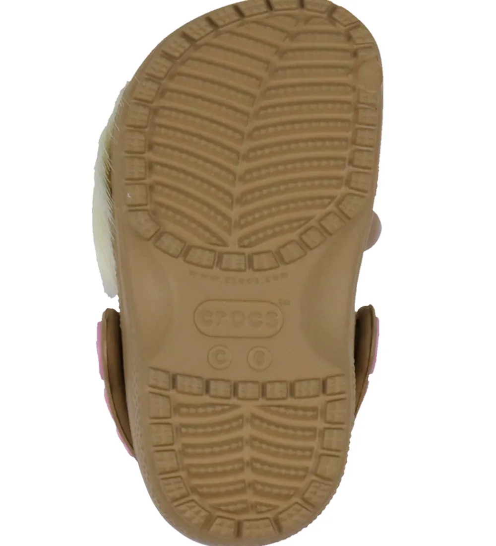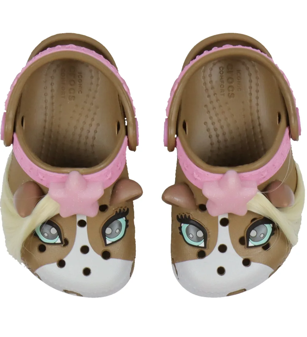 Sjove Crocs sandaler i brun og hvid med applikationer af der ligner en hest. Sandalerne har detaljer som øjne og ører, hvilket giver dem et legende udtryk. Rundt om kanten findes en lyserød rem pyntet med stjerner, der tilfører ekstra charme.