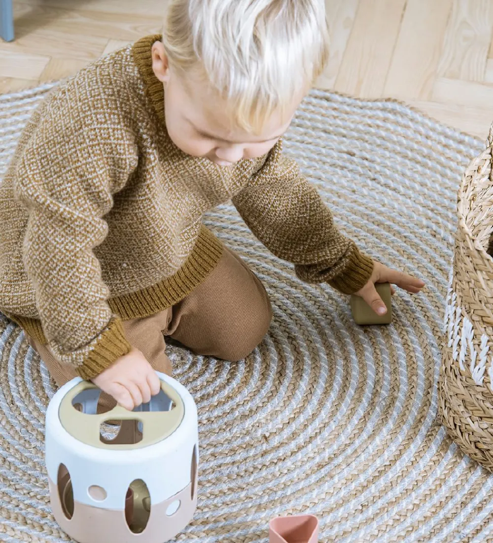Dantoy puttekassen er rund med mange forskellige dele og former. Leg med puttekassen hjælper barnet med at udvikle deres logiske tænkning, finmotoriske færdigheder og til at genkende forskellige geometriske former.