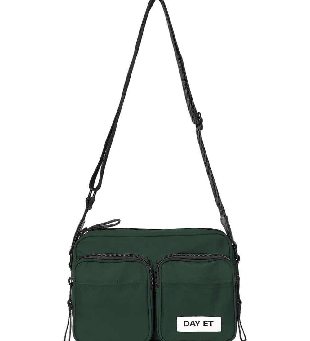 Smart DAY ET skuldertaske i mørkegrøn med kanter i imiteret læder, og et hvidt stofmærke fortil med teksten “DAY ET”.