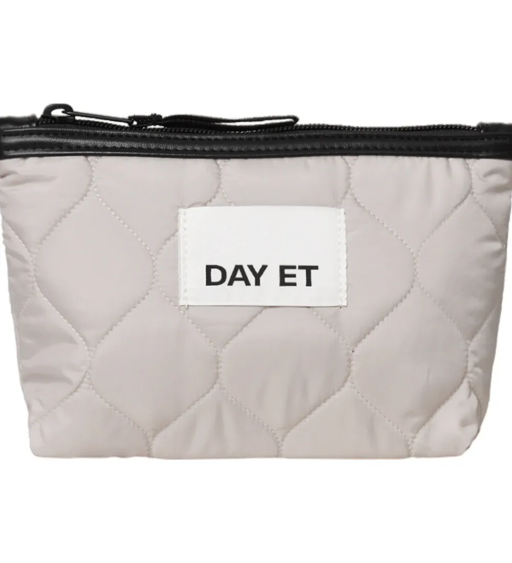 Smart DAY ET toilettaske i en gråbeige nuance med en quiltet strukur, og et hvidt stofmærke med teksten “DAY ET” på fronten. DAY ET toilettasken består af et stort rum, som åbnes med en lynlås i toppen.
