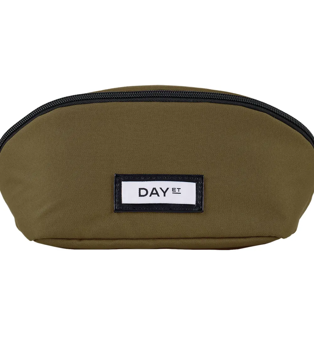 Smuk DAY ET toilettaske i mørkegrøn med en applikation på fronten i sort, imiteret læder samt et hvidt stofmærke med logo.