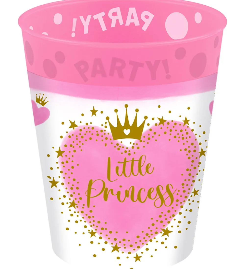 Fine Decorata Party plastikkopper i pink og med rosa og hvid print af et hjerte og en guld-prinsessekrone og teksten “Little Princess”. Plastikkopperne er solgt som en 4-pak og har hver en kapacitet på 250 ml.