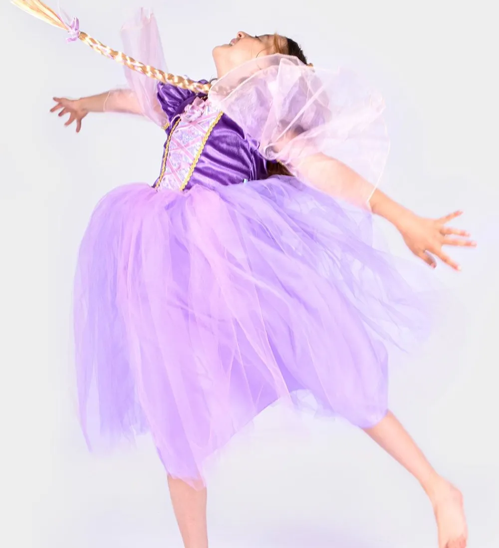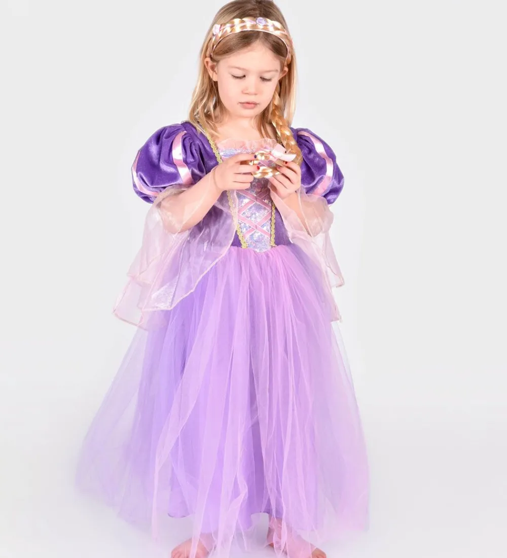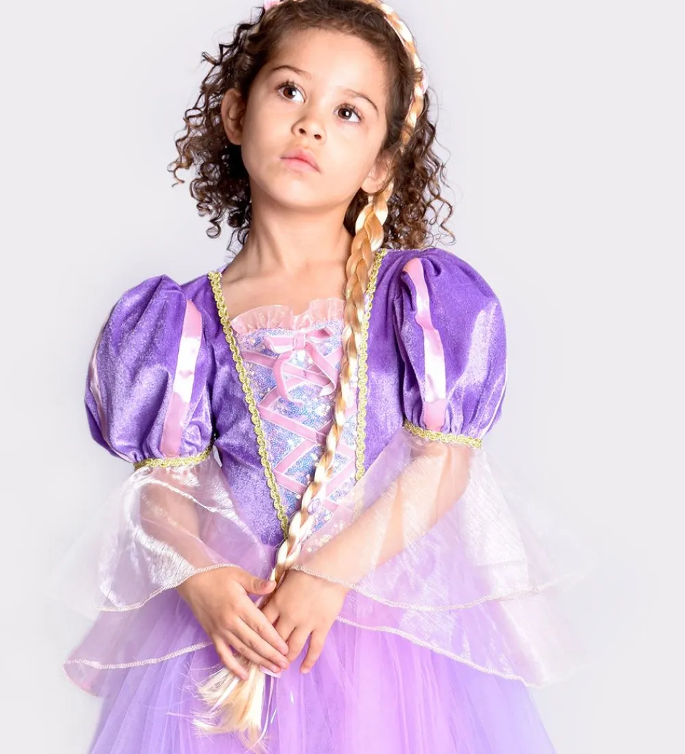 Smuk Den Goda Fen udklædning i form af lilla og rosa kjole, som er inspireret af Rapunzel. Der medfølger også en hårbøje i rosa, med imiteret blond hår.
